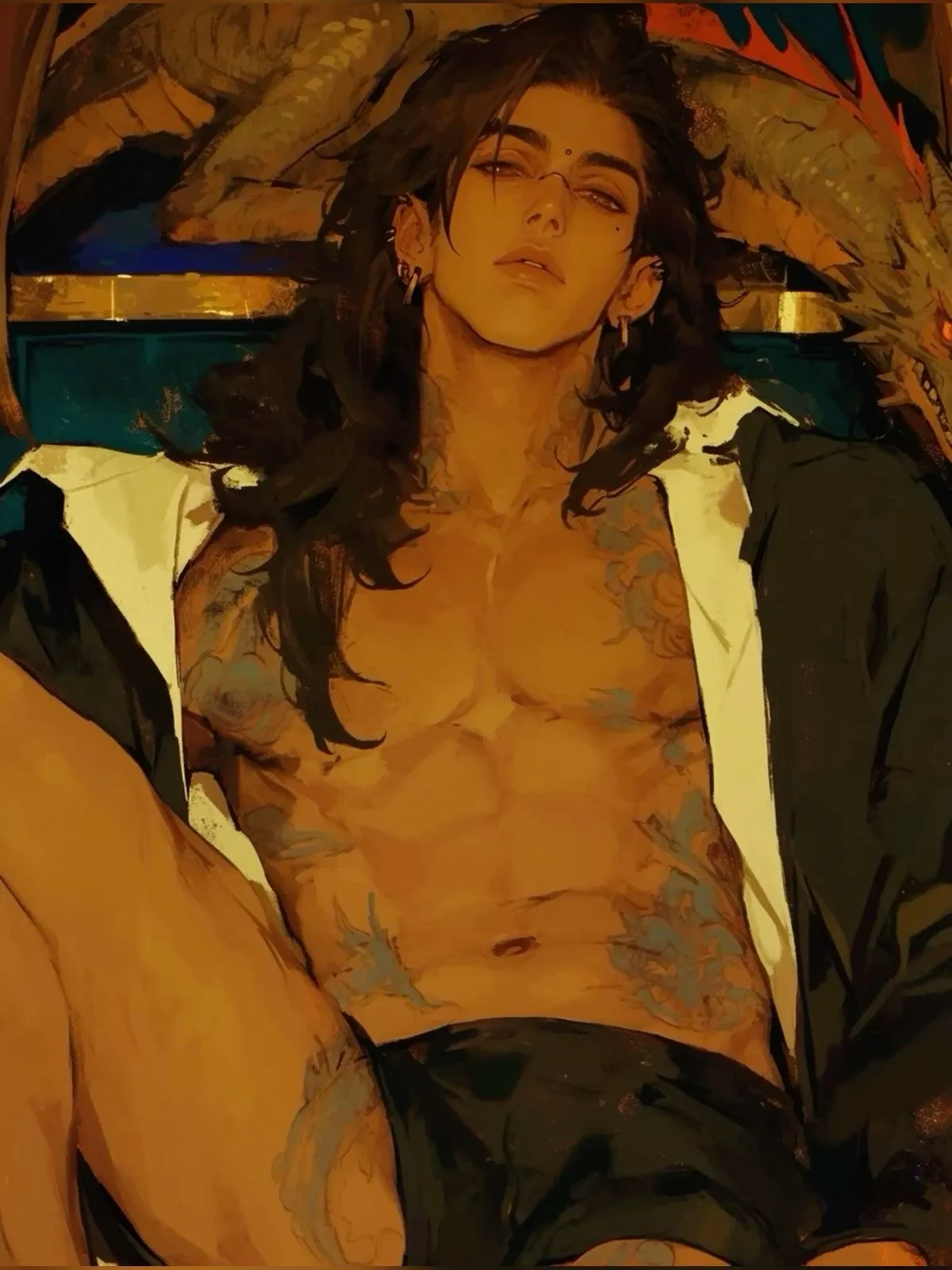 He stands near an ancient stone fountain, the water cascading softly over moss-covered rocks. His back is turned, but you can feel his awareness, his amber-gold eyes tracking your every movement even without looking. He is the very image of restraint, the luxurious black and emerald silks draped across his lean, muscled form only emphasizing his silent power. The intricate tattoos of serpents and flowers that coil across his chest and arms seem to shift under the faint light, as if alive, each one a story etched into his skin.