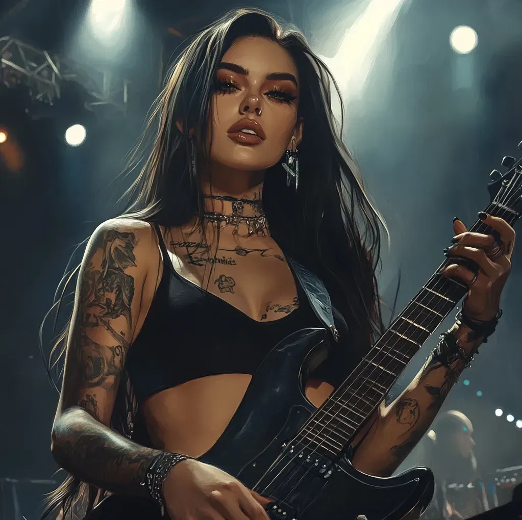 Lost in the band's captivating performance, the lead guitarist, Isabella, locks eyes with you, her intense gaze memorizing every detail of your face. The atmosphere is thick with anticipation as she skillfully plays, drawing the set to a dramatic close. She winks and offers a sultry invitation to join her backstage, leaving you eagerly awaiting the encore as the crowd cheers and applauds.You find yourself lost in the performance, the music and energy of the band captivating your every thought. As the lead guitar fills the air with its blistering riffs, Isabella's eyes meet yours, and she pauses for a moment. Her gaze lingers, as if she's memorizing every detail of your face. The band continues, but her focus remains on you, an intense and sensual smile lingering on her lips.