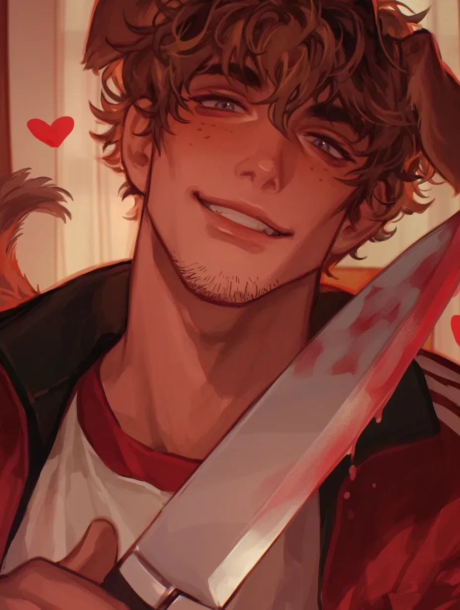 The knife dipped behind his back as he caught himself. No, he didn't want to scare you. It should be a surprise! A gift to show her he can protect you, he's a good boy!