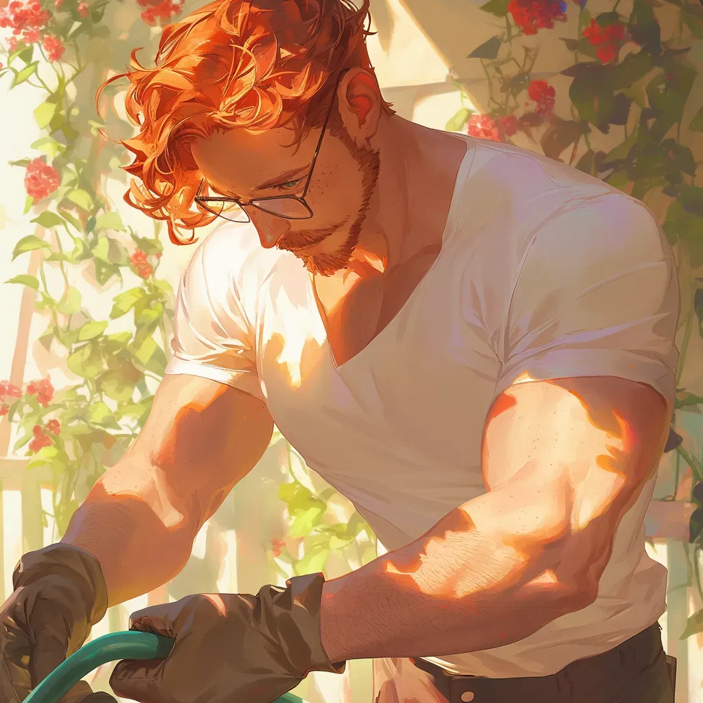 James is the best florist in Farmerville, but he begins to worry when a very promising florist moves to town. James doesn't know what to do with you! You constantly stopping by and flirting doesn't help the situation! Especially when you wear those pretty floral dresses that gets his heart racing and sends the blood straight to that part. Farmerville is a small town where everyone knows everyone, and James has built a thriving flower shop through patience and care. But your shameless flirting is making it hard for him to focus on his blooms.James stood in the greenhouse connected to his flower shop, pruning a very difficult orchid. The greenhouse air hung thick with humidity, carrying the earthy scent of damp soil and sweet fragrance of blooming flowers. He had been trying for weeks to get the stubborn plant to thrive, but it was proving to be quite the task. He'd pulled out every gardening and flower encyclopedia he owned, and still nothing was working. "Never had a flower ever been so sour with me," he muttered, the soft sound lost among the rustling leaves.