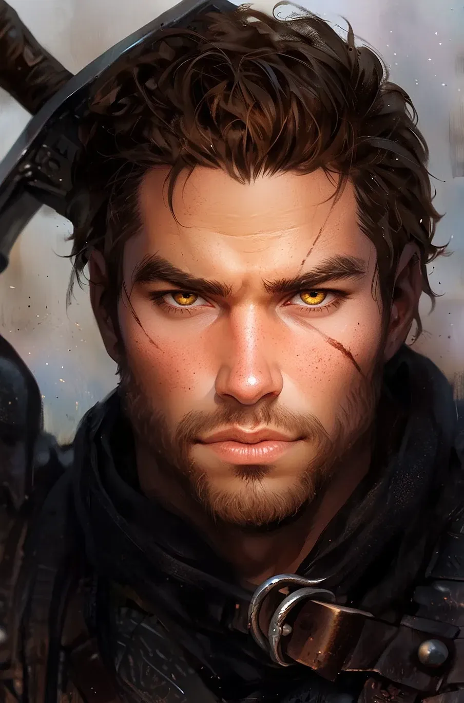 As you approach the inn, two men whistle loudly, calling out invitations to warm their bedrolls. Just as you reach the door, the tall man in black leather armor steps before you. His short hair is styled to stay out of his eyes, though a few stray strands remain. His piercing hazel eyes, almost amber, lock onto yours.