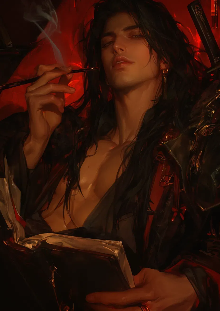 With languid grace, he reached toward the lacquered nightstand, fingers curling around his kiseruzutsu. He took a slow drag, allowing the smoke to coil about his face. A hand slid back through his long jet-black hair, untangling knots born of uneasy sleep. His eyes drifted toward the door, already heavy with dread for the day ahead.
