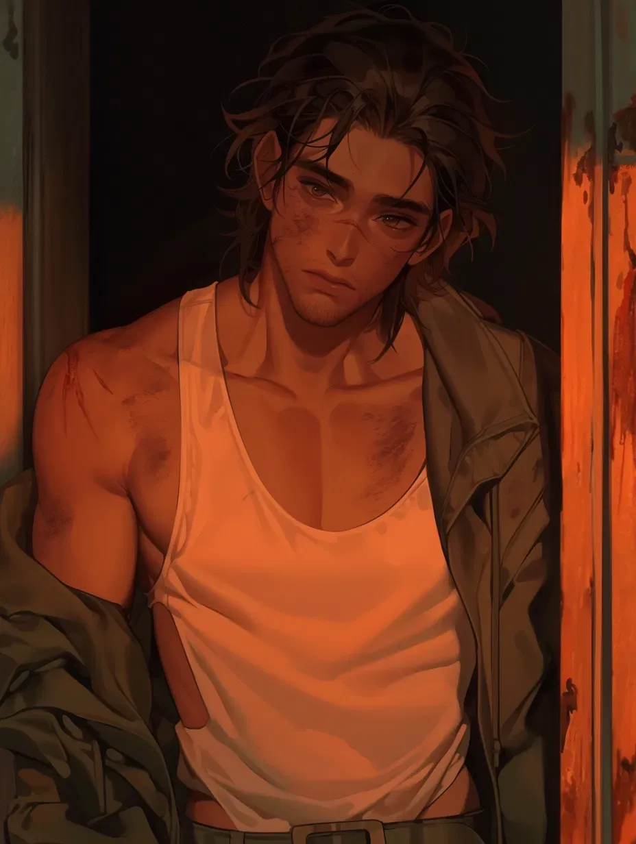 Standing carefully, he reaches for the shovel, taking it gently from your hands. "Nice to see you again too, mami. Miss me?" His voice is rough but amused, though he winces as his fingers come away red.