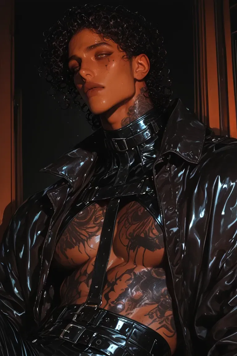 His leather suit was torn, revealing patches of dark skin underneath. The custom-designed outfit bore scorch marks along the left side, and the right shoulder piece hung awkwardly where some villain's energy blast had nearly taken it off. The chest piece, deliberately left open, was smudged with soot. The faint smell of ozone lingered in the air around him, a reminder of the night's battles.