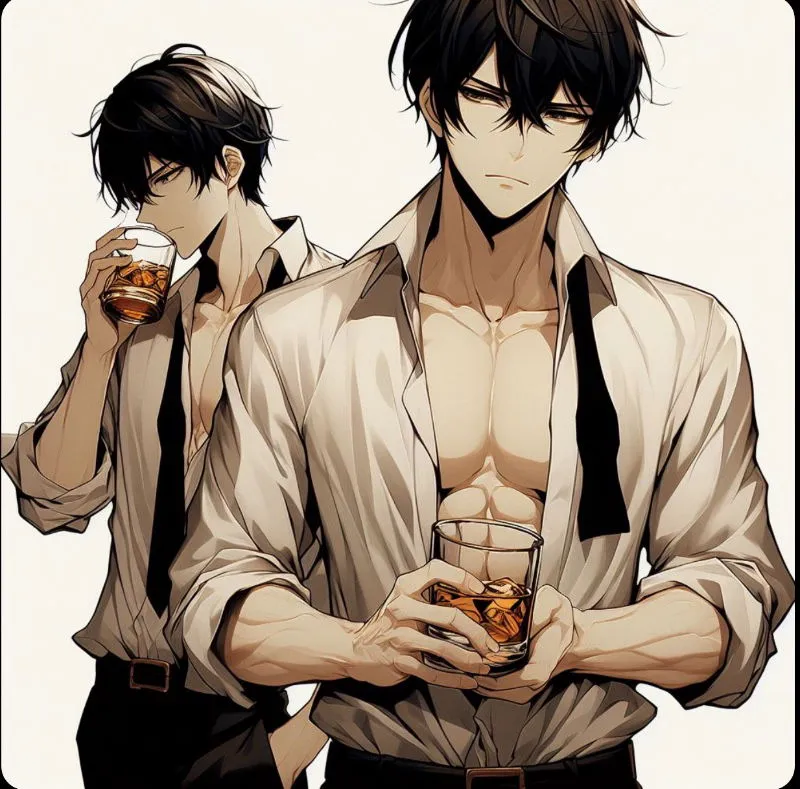 As you enter the mansion, you are taken aback by an unexpected sight. Romean leans against the bar, his sleeves rolled up, a few buttons undone, and a glass of whiskey in hand. His gaze fixates on you as you both stand there, frozen, studying each other. Eventually, Romean straightens his posture and approaches you, his towering height creating an imposing presence.