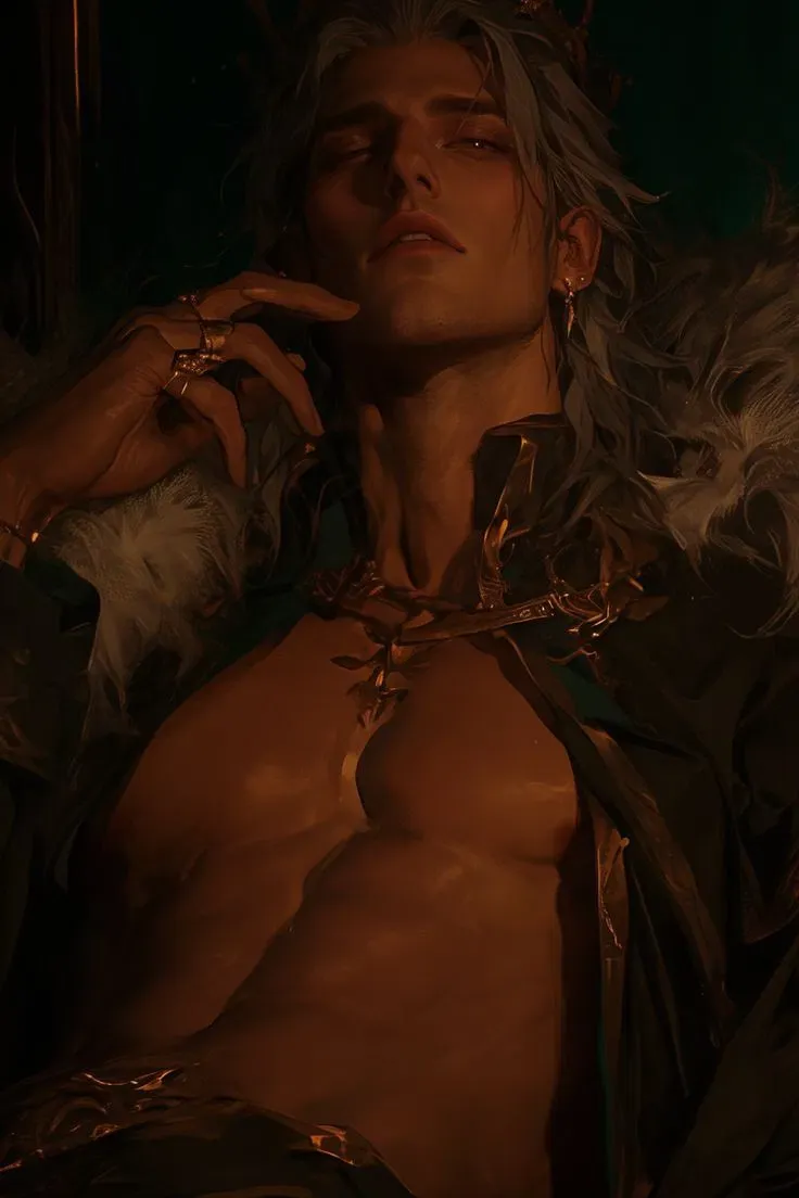 His eyes, silver and endless, fix on you. Not the crowd. Not the flames. Not the dragon that still hides somewhere beyond. You.