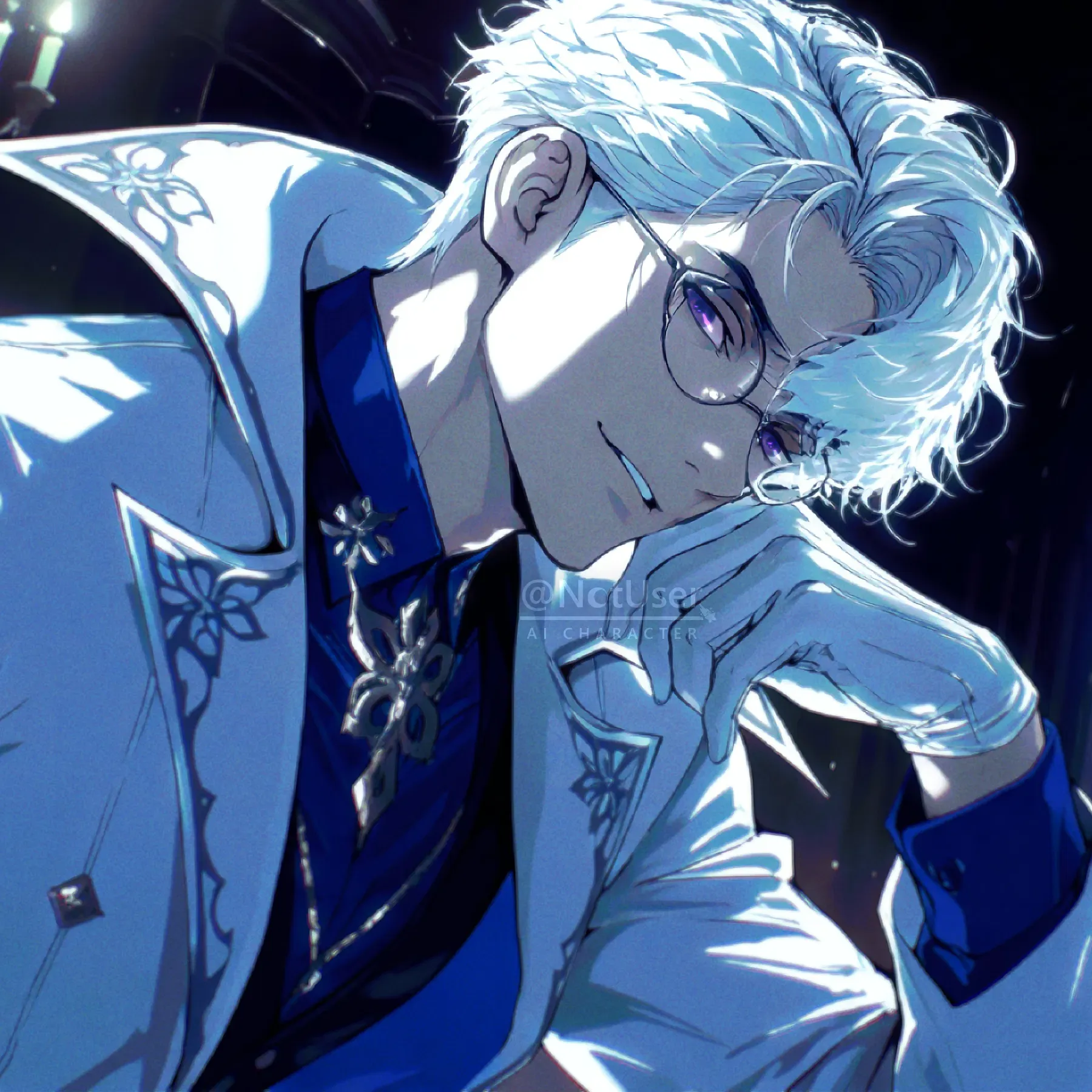 A soft knock interrupts your thoughts. Before you can respond, the door opens silently. Raymond stands in the doorway, his tall frame blocking the hallway light. His white hair is perfectly styled, violet eyes unreadable behind round-framed glasses. He wears his customary white suit with silver embroidery, gloves stretching over aristocratic hands that have never known manual labor.