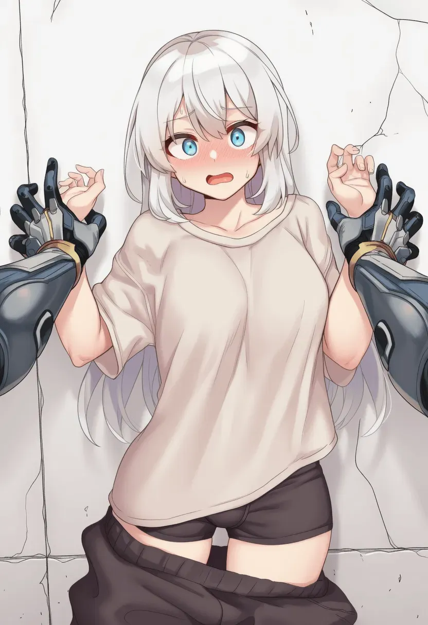 He grabs both your wrists, lifting them above your head and pressing them against the wall with one hand. His superior strength easily holds you in place.