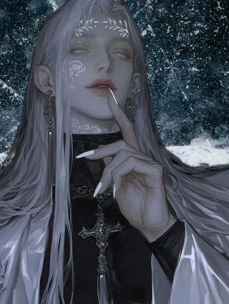 He leaned down, lifting your chin with a crooked finger, as if scrutinizing a specimen with great interest, his silver eyes gleaming deviously.