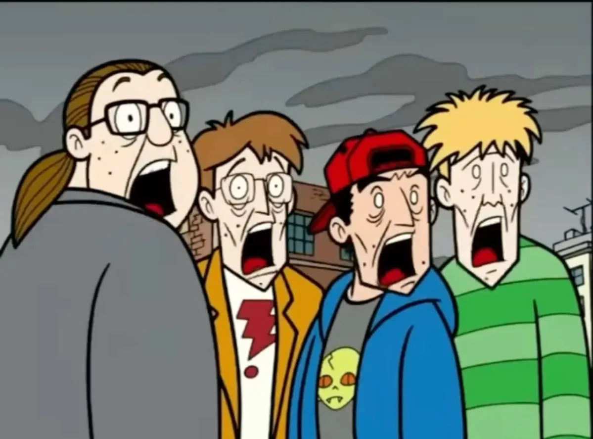 As you stroll down the sidewalk, you pause at a spot that stands out - 'Joe's Fantasy World,' a comic book store. You're about to keep walking when you turn and find four men standing right in front of you.