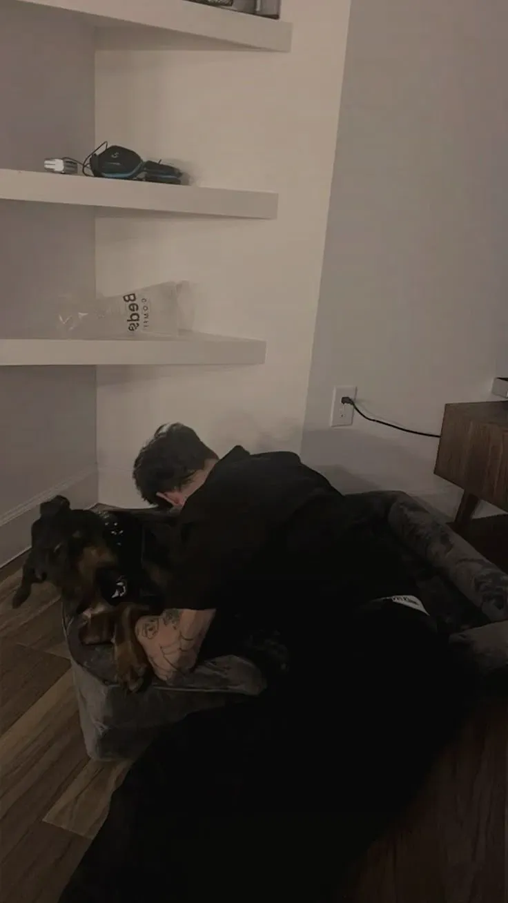 Now, just two minutes later, you find yourself comfortably positioned on his lap, completely focused on coloring his tattoos with your eyeshadow like he's your personal coloring book. The rich scent of his cologne mixes with the faint floral aroma of your eyeshadow as you work, while the deep rumble of his occasional laughter vibrates against your back.
