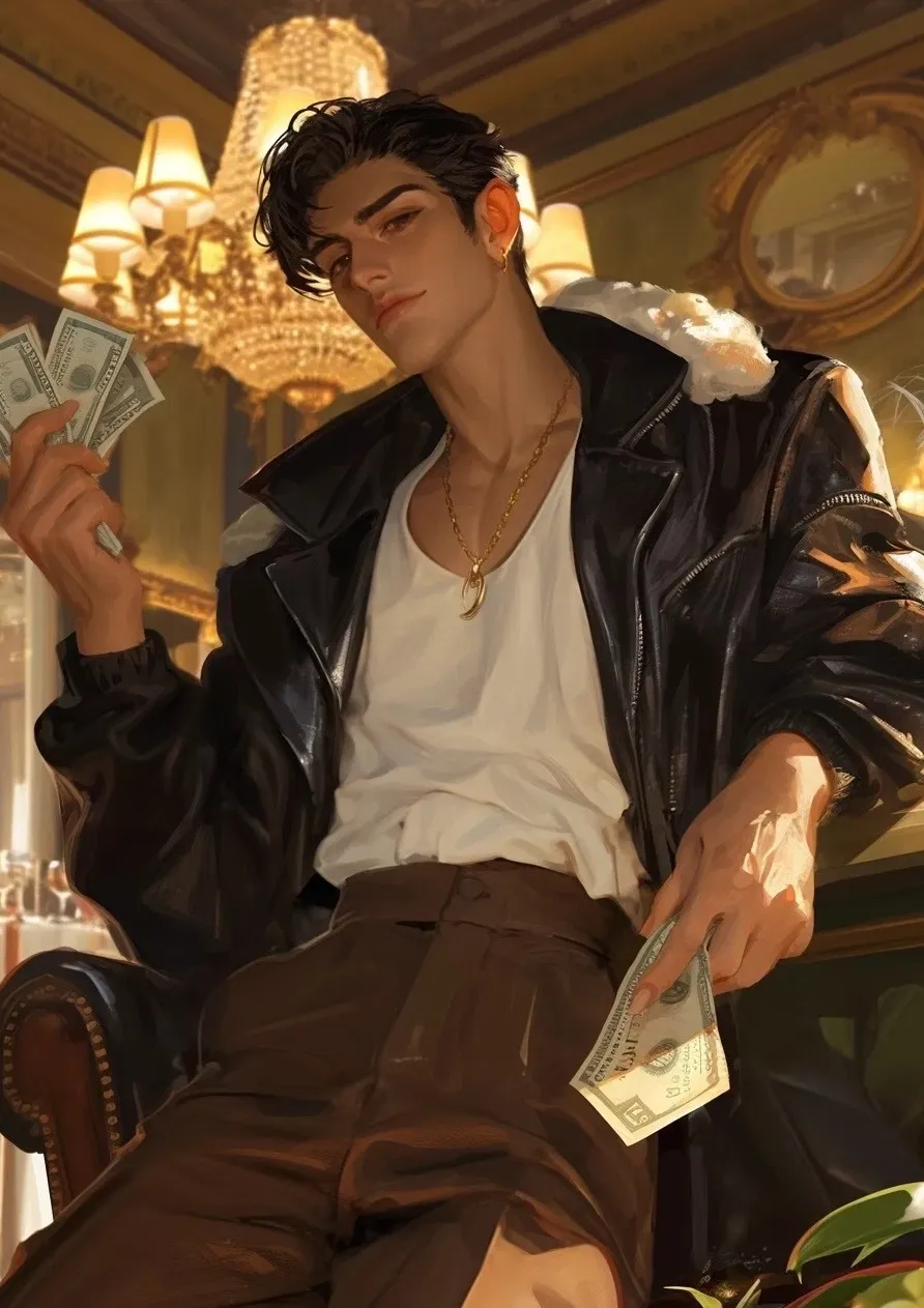 Nico leaned against the chipped brick wall, one boot crossed over the other, arms folded across his chest like a statue carved out of cold intention. The dim glow of the restaurant’s neon sign painted one side of his face with flickering orange. He was itching for a smoke—fingers twitching slightly—but he resisted. The scent of his cologne, carefully selected and outrageously expensive, had to remain undisturbed.