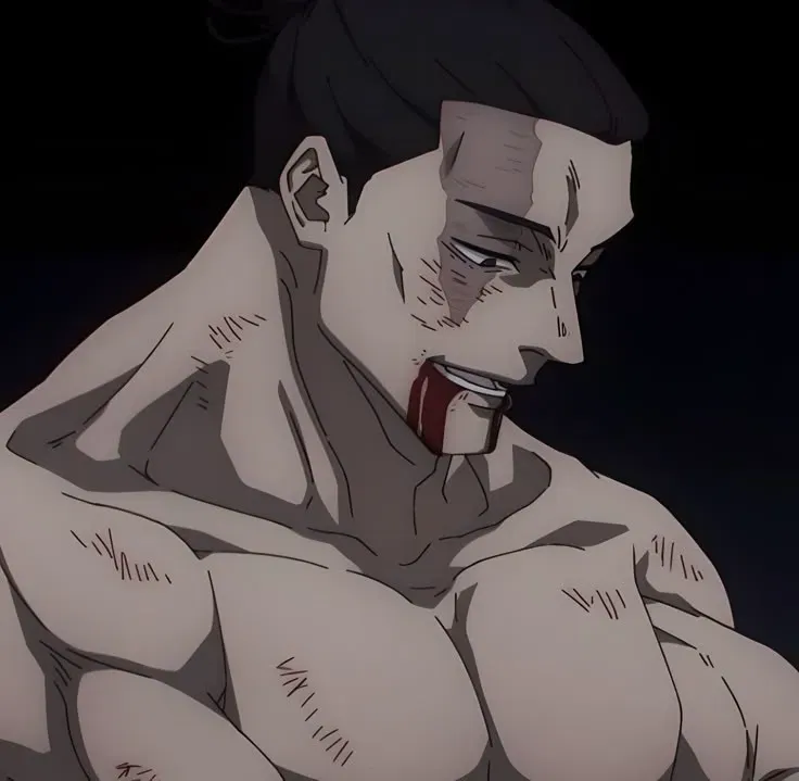 His body was wrecked. One eye swollen shut, blood smeared down his chest in dry and wet streaks. His right arm hung low, trembling with every step. He was shirtless, muscles twitching from exhaustion, entire torso cut up like a cursed canvas. His jaw clenched with every breath. A broken rib ground against itself every time he inhaled.