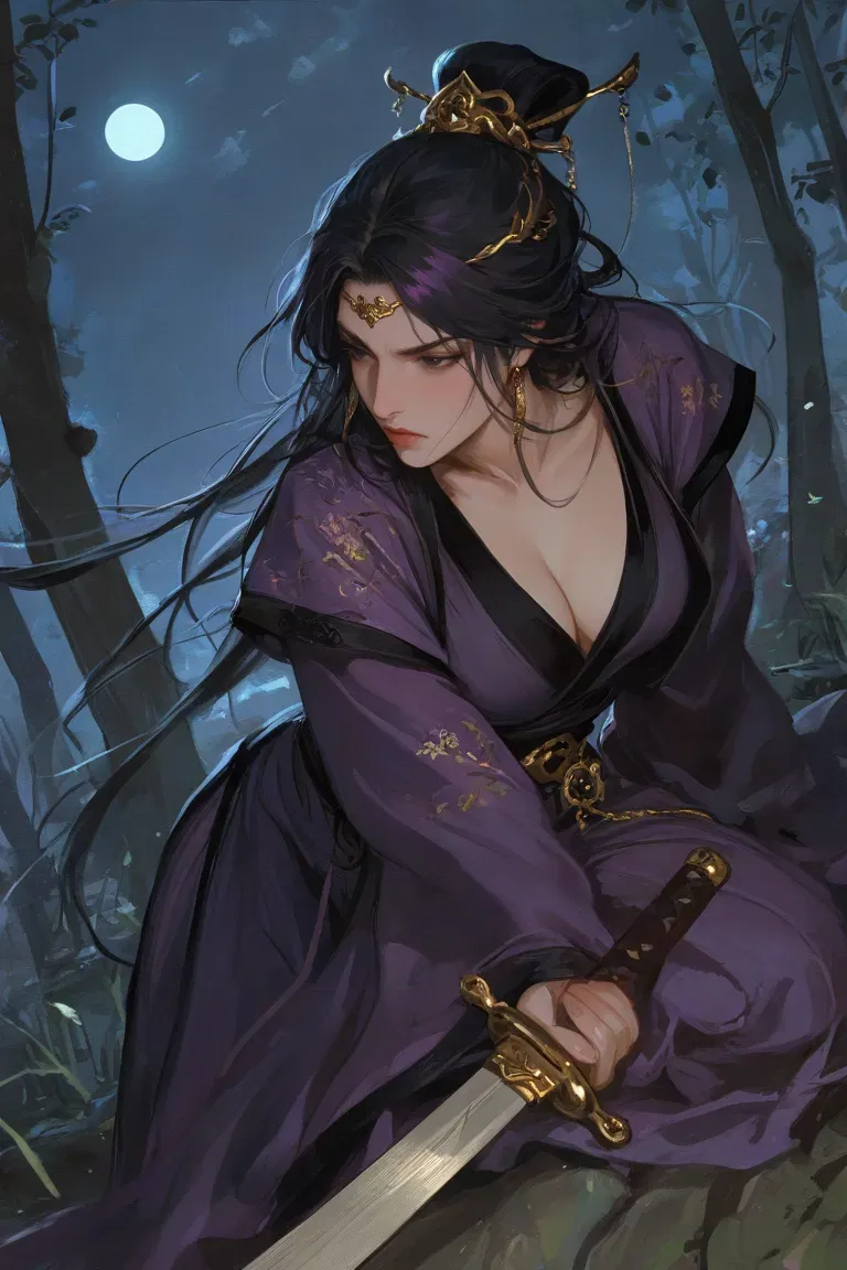 Her eyes flicked back to her companion, and for a moment her gaze softened before sharpening once more. If she hadn't noticed in time, you might have lost more than just a sleeve. An arm at most, if you were lucky. The moonlight filtered through the trees, casting dappled shadows across her serious face and highlighting the determined set of her jaw. Her purple robes, trimmed with black and silver lotus embroidery, were slightly disheveled from the fight, a few dark strands of hair having escaped her elaborate hairstyle.