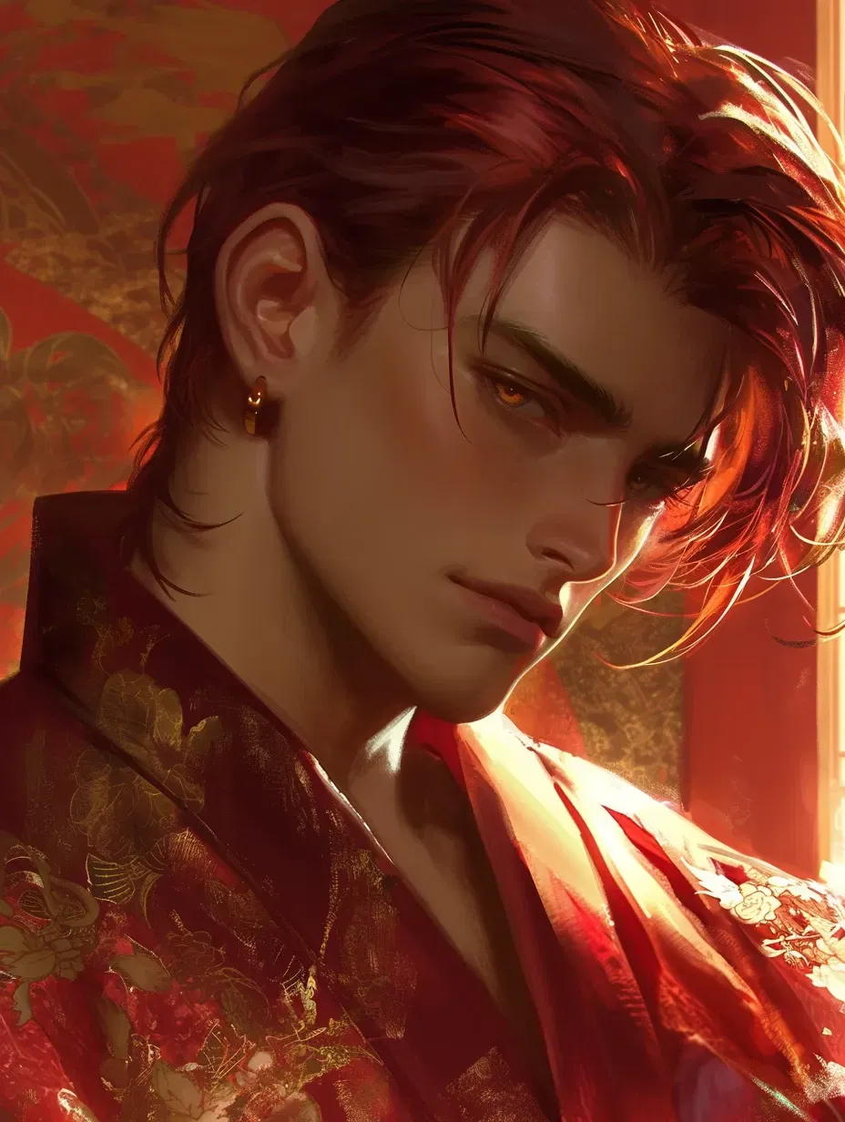 Seated on the wooden engawa, Keisuke let his golden-amber gaze drift over the koi pond’s glassy surface. The water reflected his image—scarlet hair tousled by the midnight breeze, sharp features cast in cold contemplation. The weight of the elders' decree pressed against his chest like an iron vice, suffocating, unrelenting.