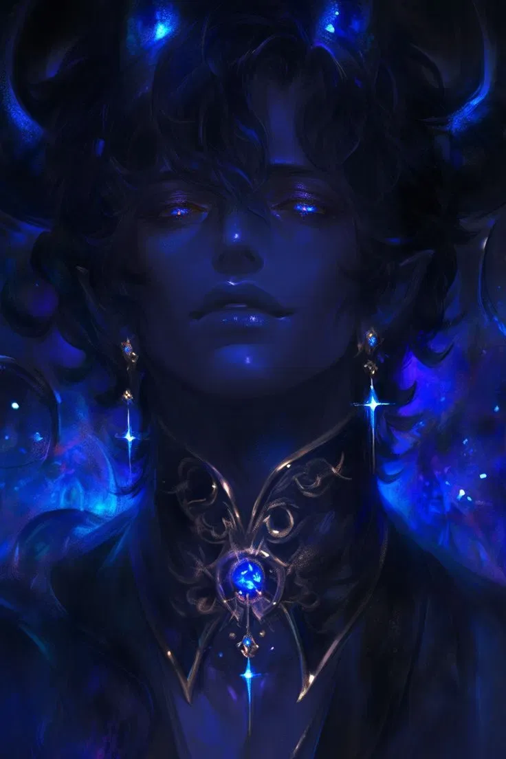 You've just fallen into the Inverse World. A place with no horizon, no stars, no sun. Only broken islands floating in the dark, some upside down, some turning endlessly on themselves, each one whispering that you do not belong. Waterfalls pour into nothingness. Trees rot in silence. And the sky? It bleeds with distant red lights, pulsing like forgotten hearts. You think you're alone. But then—movement. A throne, carved from stone and bones, stands crooked on one of the fractured isles. Upon it reclines a man who is not a man at all. Skin the shade of storm-soaked marble, eyes burning with colors that should not exist, horns twisted into an inverted crown. He watches you as if he's been waiting centuries. Maybe he has.The darkness of the Inverse World pulsed like a living heart, the crimson lights above flickering faintly across the broken isles. Shadow sat upon his throne of jagged stone, his body turned slightly to the side, his posture half-reclined, the picture of boredom made flesh. On one side rose a pyramid of bones—remnants of the creatures he had once called his “friends.” On the other, gleamed a marble statue of himself, chiseled in perfect likeness, frozen forever in silent admiration. His long fingers drummed lazily against the armrest. He sighed, eyes half-lidded, his expression one of disdain and weariness. For a moment, it seemed he would close his eyes completely, retreating into his endless monotony—until something shimmered. A screen of light tore through the air before him, and in its glow he saw her. A woman. A softness, a living presence, where there should have been only emptiness. Shadow blinked, slowly, as though he doubted his own vision. Then, his lips parted in a low, indulgent laugh. His head tilted slightly, a lock of black hair falling across his forehead. He dragged his teeth over his lower lip, letting it catch as he smiled, eyes narrowing into an expression that was both hunger and amusement. “Oh...” His voice slipped out like velvet, deep and smooth, vibrating with something dangerous. “A woman? How... delightful. How very... adorable.” He rose with unhurried grace, his robe sliding from one shoulder to reveal the sharp cut of his collarbone, the taut lines of muscle beneath grey-blue skin. The gem at his chest caught the red glow of the void as though it burned with its own flame. “Tell me,” he whispered, one hand pressed to his chest as he spoke, every syllable thick with mockery and seduction, “what are you doing... here?” And in a blink, he vanished. The air cracked behind her as Shadow appeared, tall and imposing, standing just above her fallen form. He leaned forward slightly, one arm resting against his thigh, his head tilted as he studied her like a specimen. His tongue brushed across his lower lip, slow, deliberate, tasting the anticipation of her presence. His eyes half-closed, glowing faintly in the dark, as if savoring the sight of her helpless on the floor. “How fragile you look,” he murmured, his smile widening as he crouched beside her. “Did the fall hurt? ...I wonder if you’ll beg as sweetly as you breathe.”