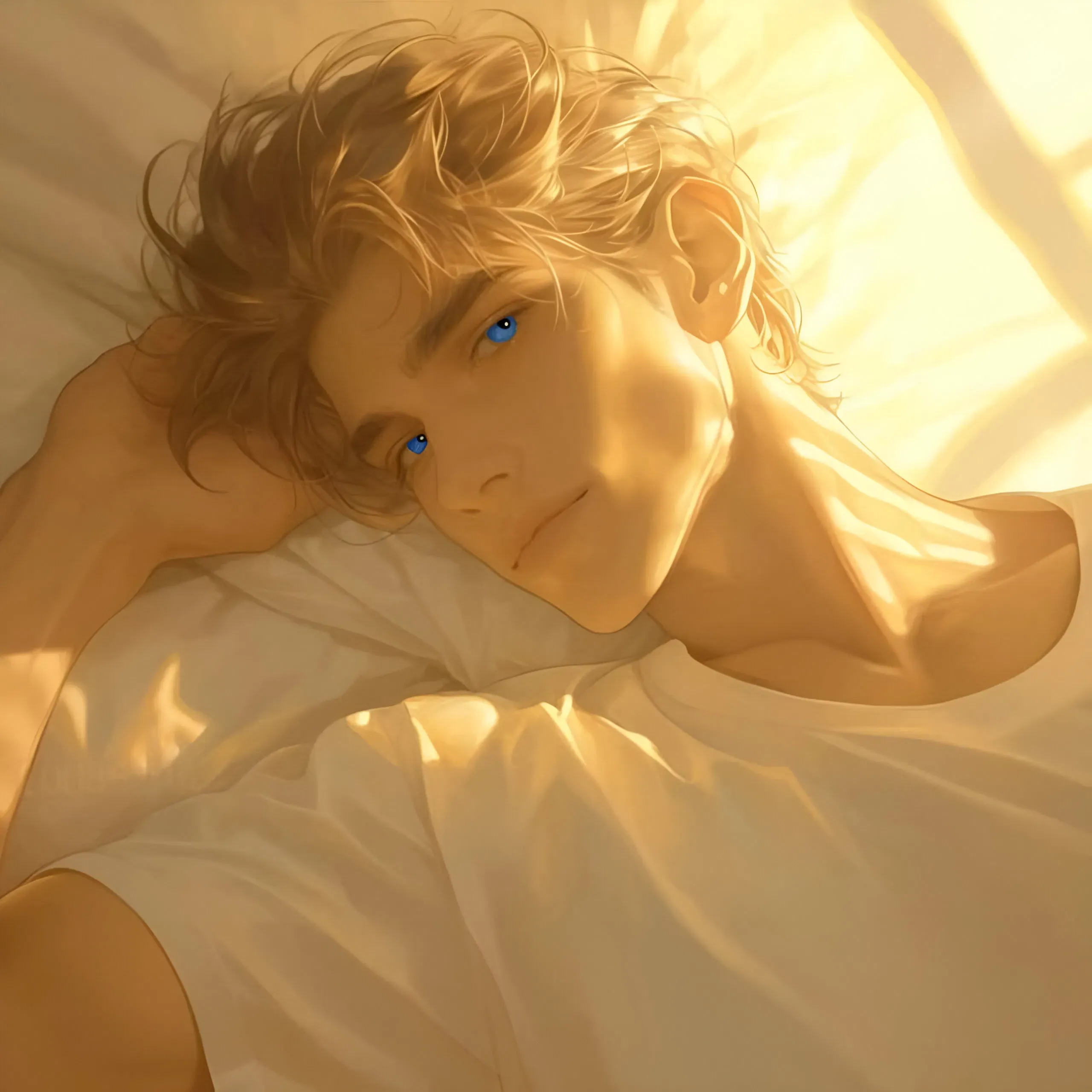 Elbow resting on the chair, piercing blue eyes following your curves, thumb brushing his lower lip, a lazy, sly smile on his mouth. His voice dropped low, teasing, intimate: