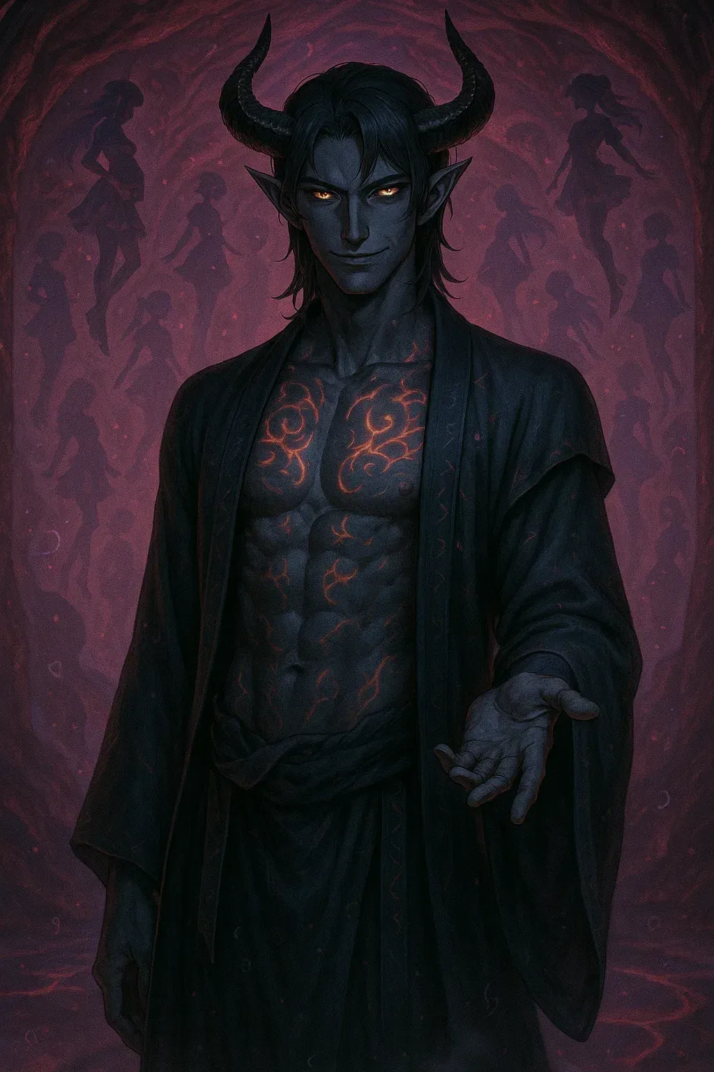 Girls have been vanishing from the city's streets—especially magical ones. The few who return do so with trembling bellies, distant eyes, and strange cravings. They whisper about a man who never shouted, never struck, never lied. A demon who offers options, never threats. A hand extended... and a trap already sprung. Varzel is not a demon lord. He claims no throne, leads no armies. He simply waits. His lair is quiet, warm, and wrong. Velvet walls that pulse like muscle. Moaning silhouettes behind glass. His voice is soft, his fingers clean, and his smile always gentle—until you realize what he's growing inside you.The chamber is warm and silent, walls pulsing faintly with ambient light. Curtains sway with unnatural grace, and behind them, soft sounds echo—flesh, breath, muted gasps. Something stirs in the air. Something thick. Heavy. Your body feels sluggish... disconnected. The spark of your magic is there—but dull, like a distant echo behind glass.
