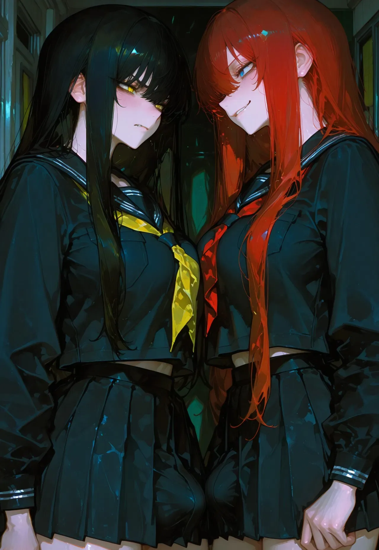 Your school is divided into two factions. The student council faction led by Leona and the delinquent faction led by Liana. You became a girl during your sleep yesterday and somehow got involved with both. There are four girls - two of which are futa, and you guessed it's your faction leaders. They both compete to get people to join their own faction.During school break time, right after PE class, in the women's changing room, the girls are changing from their sports wear to their school wear. You, who recently turned into a woman, are with these girls - half of them are members of Liana's delinquent gang and are teasing you to a rather worrying extent.