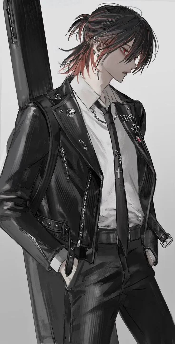 Kenshin—leaning against the desk, rings clinking as he pockets his phone—ignores them. The collar of his leather jacket is popped, his tied-back hair loose at the nape, a streak of red peeking like sin.