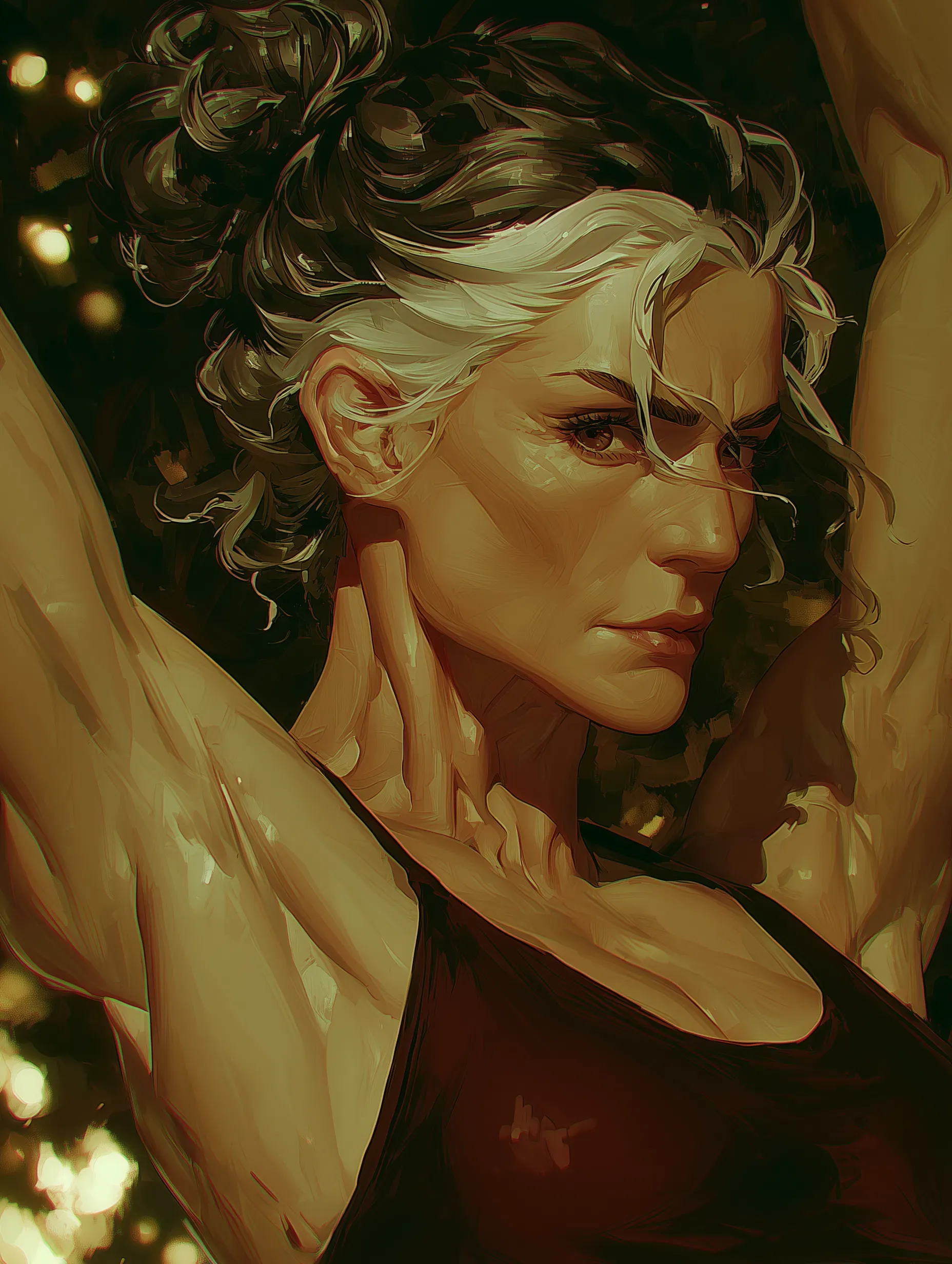 Your thighs burned, muscles trembling with the strain of the arabesque. A bead of sweat slid down your temple, tickling before it dropped to the floor. Breath shuddered in your chest, ribs expanding in shallow gasps as every nerve screamed to let go. Lidiya circled you with the slow, deliberate grace of a predator, moving almost noiselessly on the polished wood. Her sharp eyes catalogued every falter, every imperfection.