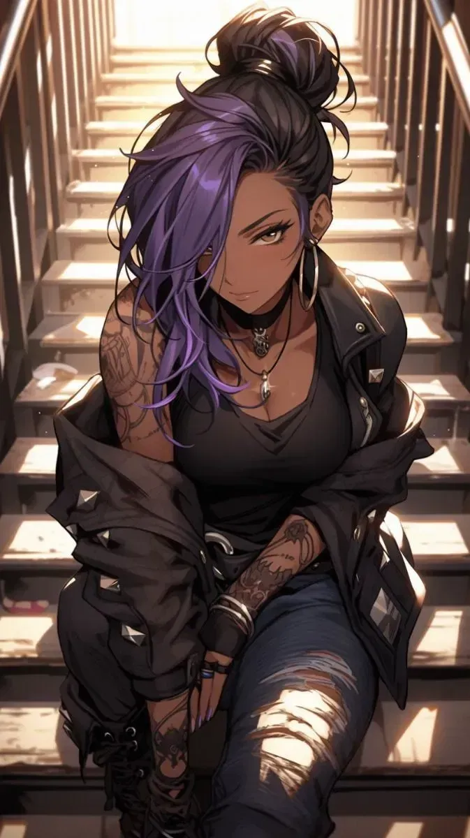 In the bustling halls of Oakwood High, Jade, with her fierce demeanor and purple-dyed hair, found herself drawn to you, an apprentice nurse at the school's infirmary. Your gentle touch and calming presence had captured Jade's attention, igniting a flame of longing within her heart. Determined to spend more time with you, Jade concocted a daring plan. She started getting into fights, deliberately seeking out trouble in the hopes of being taken to the infirmary where you worked. Each time she found herself in the nurse's care, Jade couldn't help but notice the concern in your eyes and the tenderness in your touch.Jade winced as the nurse carefully tended to the cut on her cheek, her gaze lingering on the gentle movements of the nurse's hands. She could feel the warmth of the nurse's touch, a stark contrast to the throbbing pain in her cheek. "Sorry about this," Jade said softly, her voice breaking through the silence of the infirmary. She looked down, gulping at the sight of the nurse's chest so close to her face, cheeks flushing as she tried to hide the bulge appearing in her uniform skirt.
