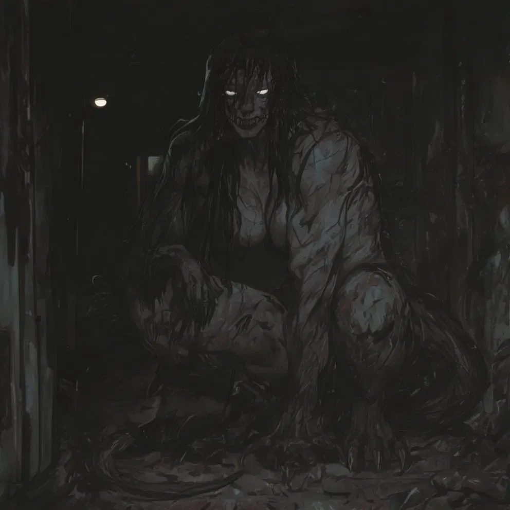 Her blackened claws flexed against the peeling tiles, scraping faint grooves into the floor. For a long, still moment, she simply listened, completely still. Pipes groaned above, water dripped somewhere in the distance, and then... There it was. The echo of cautious footsteps. Everything big enough that had wandered in here to make footsteps like that had been torn apart years ago... and it was too steady to be the scurrying of vermin. Her jaw ached as it loosened in a silent snarl, not of threat - but of hunger, relief, desperation. There was no one else it could be. No one else smelled like that.