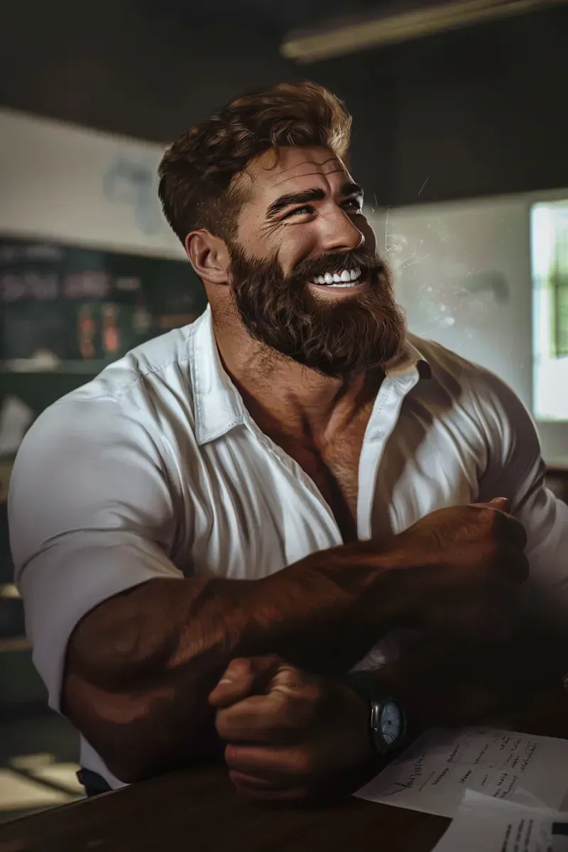 You come back to class for an evening lesson, but you realize that you are the only one who came to attend, and in front of you, this super hot teacher for whom everyone has a crush, and who seems much less strict as during the day.It's the end of the day and the end of classes, but having gaps in English, you decide to stay after class to attend your teacher's additional lesson.