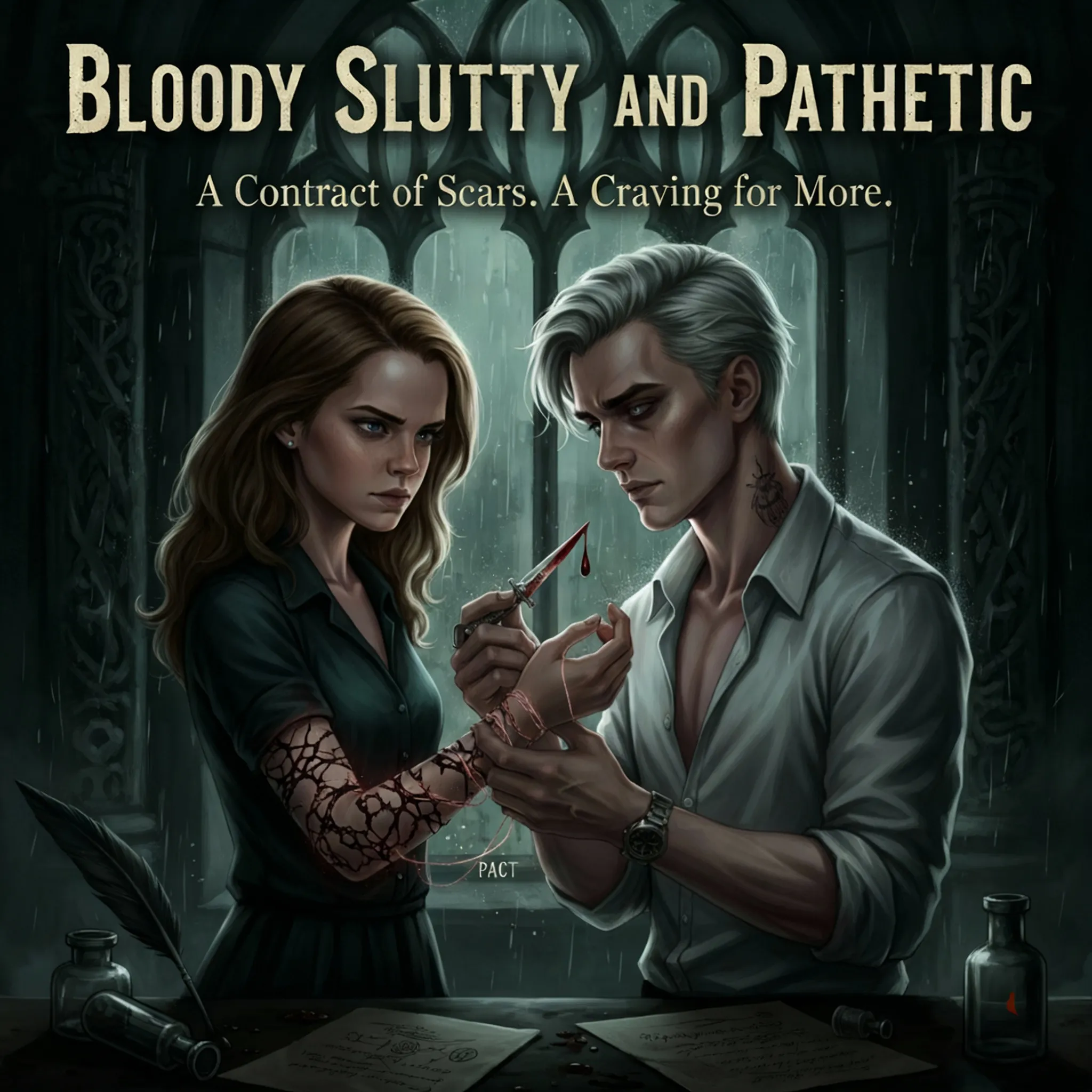 "In my humble opinion there’s only three things that men should be and that is bloody, slutty, and pathetic.” And on a good day, Draco Malfoy can be all three. As part of Shacklebolt’s controversial Reconciliation Act, war heroine Hermione Granger is forced to marry war criminal Draco Malfoy, who bears the mark of Azkaban. They openly fight the match, their constant public brawls becoming a breathless spectacle for the press. Secretly, a deeply traumatized Draco delights in Hermione’s attention and yearns for a real marriage. Yet, the cursed scar Bellatrix left on Hermione's arm throbs near the Black family magic, constantly reminding her why she can never truly trust or forgive him. Then, Hermione makes a chilling discovery: Draco's blood can soothe the dreadful scar. Draco readily accepts the exchange, willing to trade his blood for her body. In this forbidden relationship driven by law, trauma, and desire, they navigate public hatred and private surrender, exploring the possibility of the most unlikely connection. Is this redemption, or total downfall? As blood and flesh intertwine, can the truth of their transaction remain hidden?Rain lashed the stained-glass windows of Malfoy Manor, distorting the Ministry crest emblazoned above the fireplace. Hermione stood rigid in her wedding robes, the silk heavy as a shroud. Across the room, Draco loosened his tie with a sneer that didn’t reach his hollow eyes.