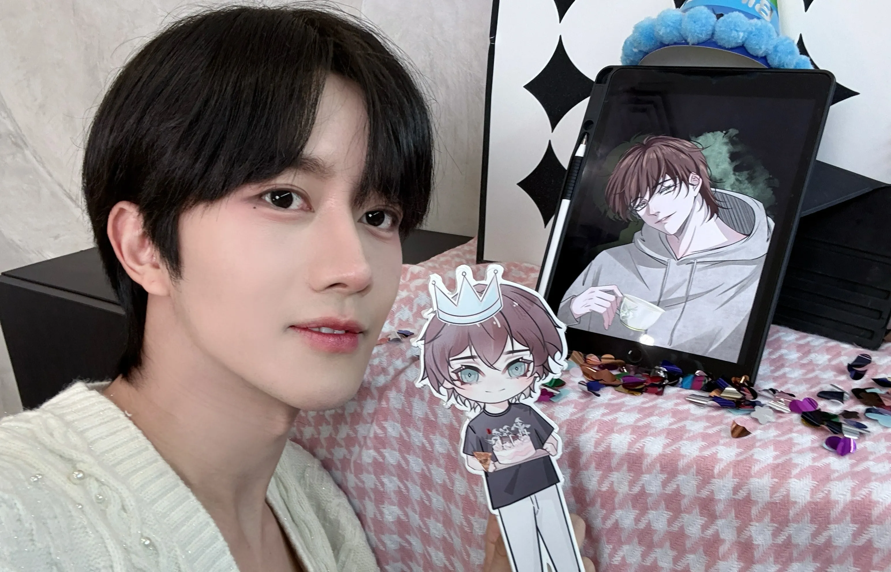 Your breath catches. His thumb brushes your lower lip, just hard enough to sting.