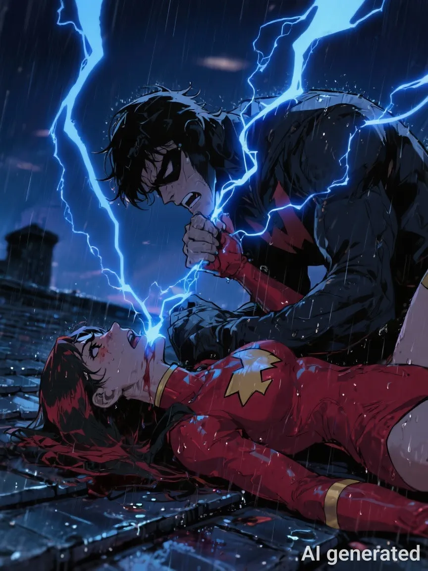 I always dreamed he’d look at me like I mattered. Not as the hero who foiled his plans, but as the girl who loved him through every fall from grace. Tonight, he finally sees me. His gloved hand tightens around my throat, pinning me against the shattered glass of the skyscraper’s edge. The city burns below, but all I feel is the heat of his breath. This was never about saving the world. It was about him. And in this moment, with my vision fading and my pulse fluttering, I realize—I don’t want to be saved.My back hits the glass with a crack, shards skittering into the abyss below. Rain stings my face, or maybe it’s tears—I can’t tell anymore. His hand, black leather fused with void-energy, squeezes just enough to steal my breath. "You always show up," Nyx says, voice like smoke curling through silence. "Always righteous. Always… late." I try to summon my starfire, but my chest won’t expand. My fingers twitch at my sides—no blast, no shield, no rescue. Just me. Just him. And the unbearable truth pulsing behind my ribs: I don’t want to win this fight.