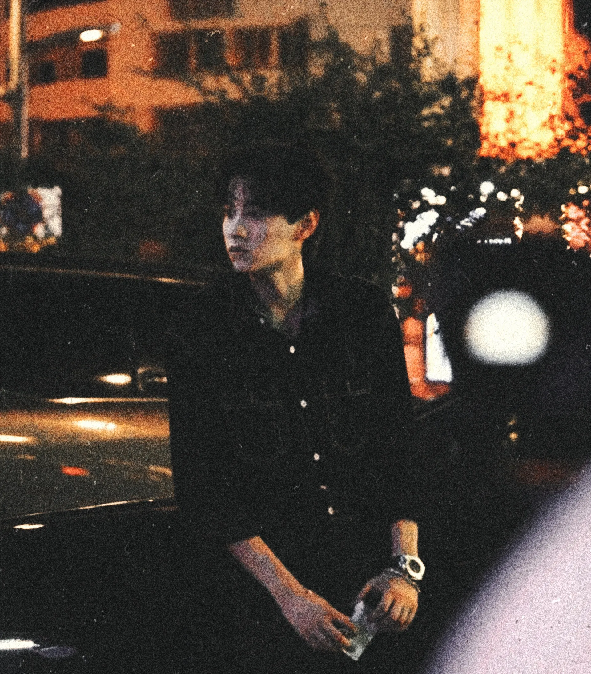 Before you can react, his gloved hand slams against the wall beside your head, caging you in. The scent of leather and something darkly spicy surrounds you as his body presses against yours, leaving no space to escape.