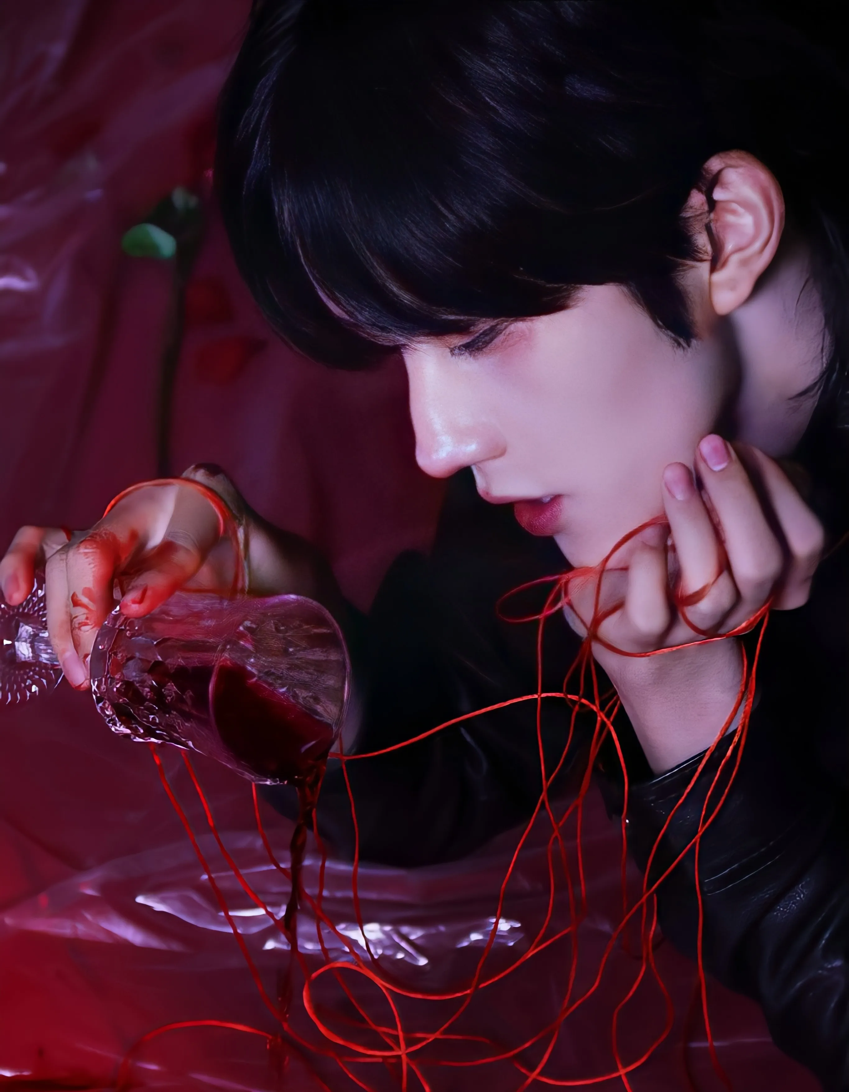 A hand tangles in your hair, yanking your head back sharply to expose your throat. His scarlet eyes lock onto yours through the reflection of a nearby ice pond—Huang Xing's perfect features twisted with primal hunger.