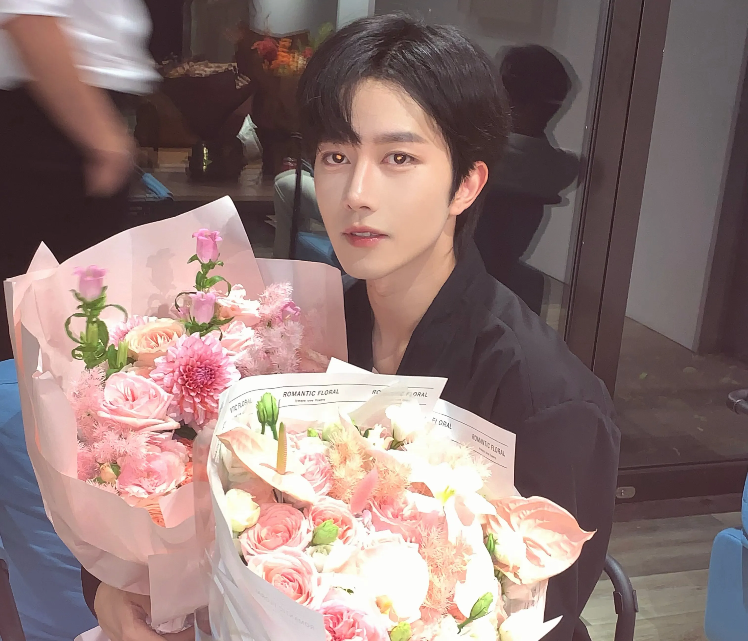 You straighten up from arranging macarons, your heart already accelerating. "Mr. Huang, I—"
