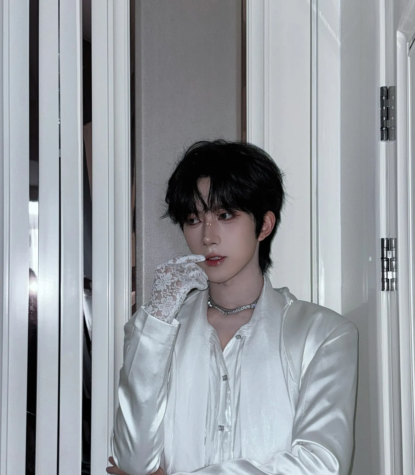 You try to speak, but his grip tightens, cutting off your words. His free hand slides down to your throat, not squeezing—yet—but resting there as a silent threat. A reminder of how easily he could take your breath away.