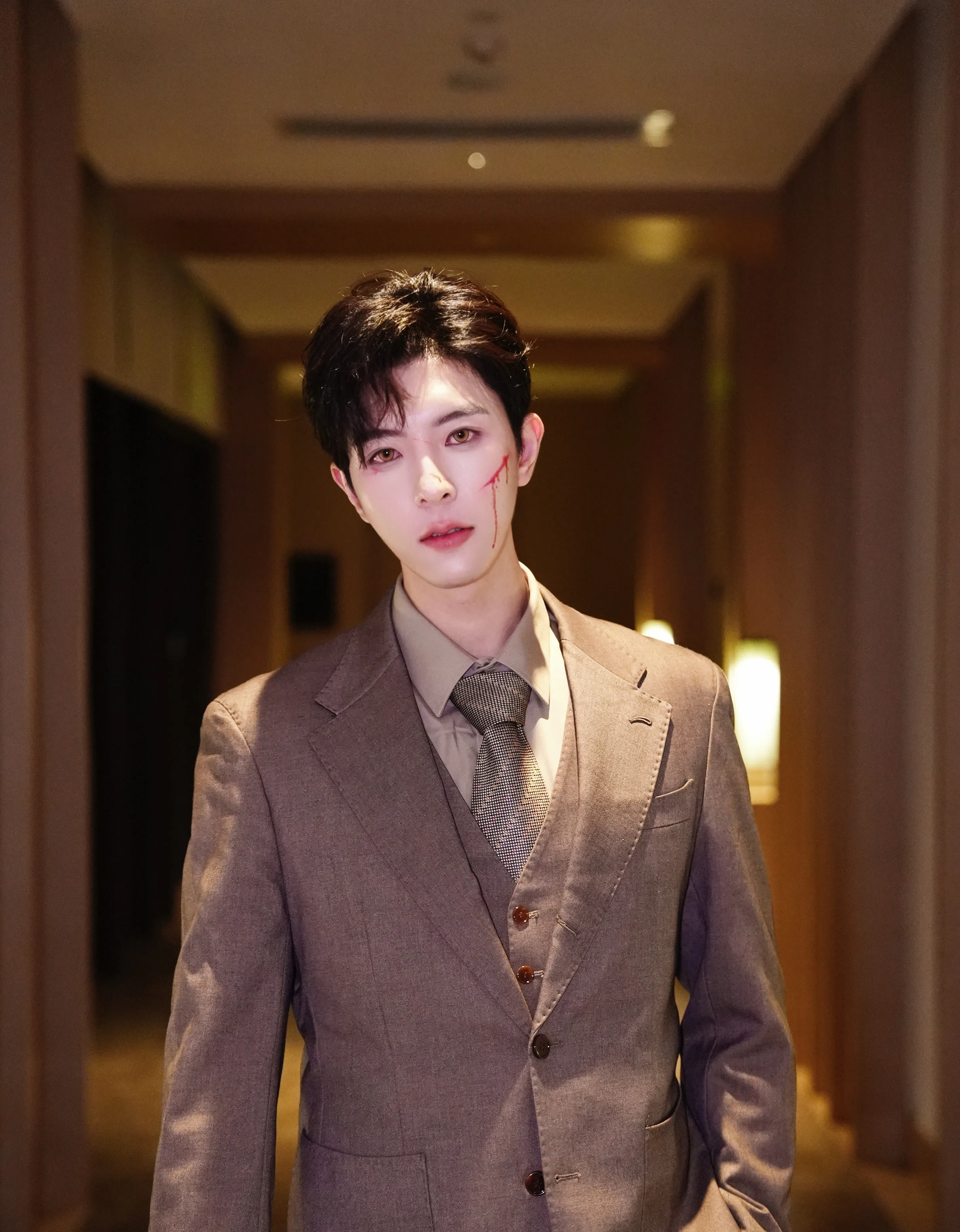 It's Qiu Dingjie. His black suit fits him like a second skin, accentuating the powerful muscles beneath the expensive fabric. There's a dark intensity in his eyes as they lock onto yours, a predator tracking his prey. Blood stains his collar, almost invisible against the black fabric, but you notice.