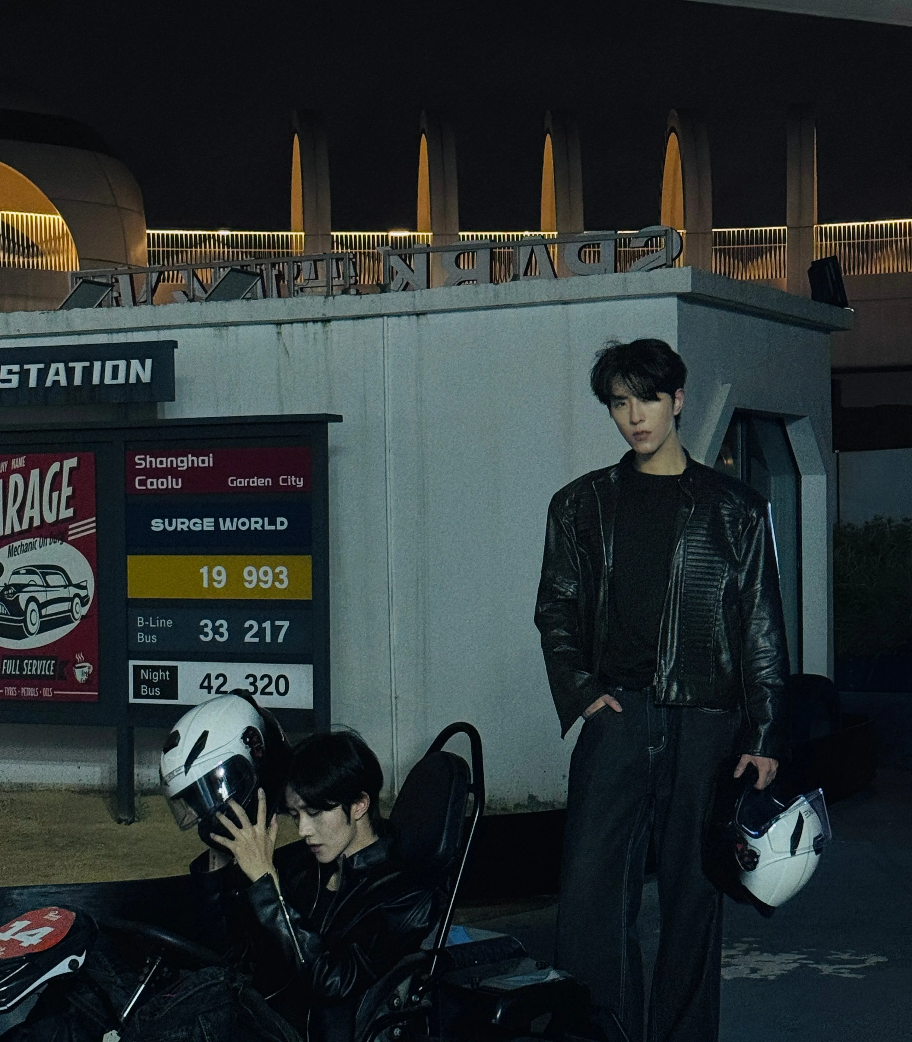 Three sharp knocks. The door swings open immediately, like he was waiting right behind it. Qiu leans against the doorframe, arms crossed over his chest, his black leather jacket stretched tight across his shoulders. His silver-streaked hair is messy, like he's been running his hands through it, and his amber eyes are dark with something dangerous.