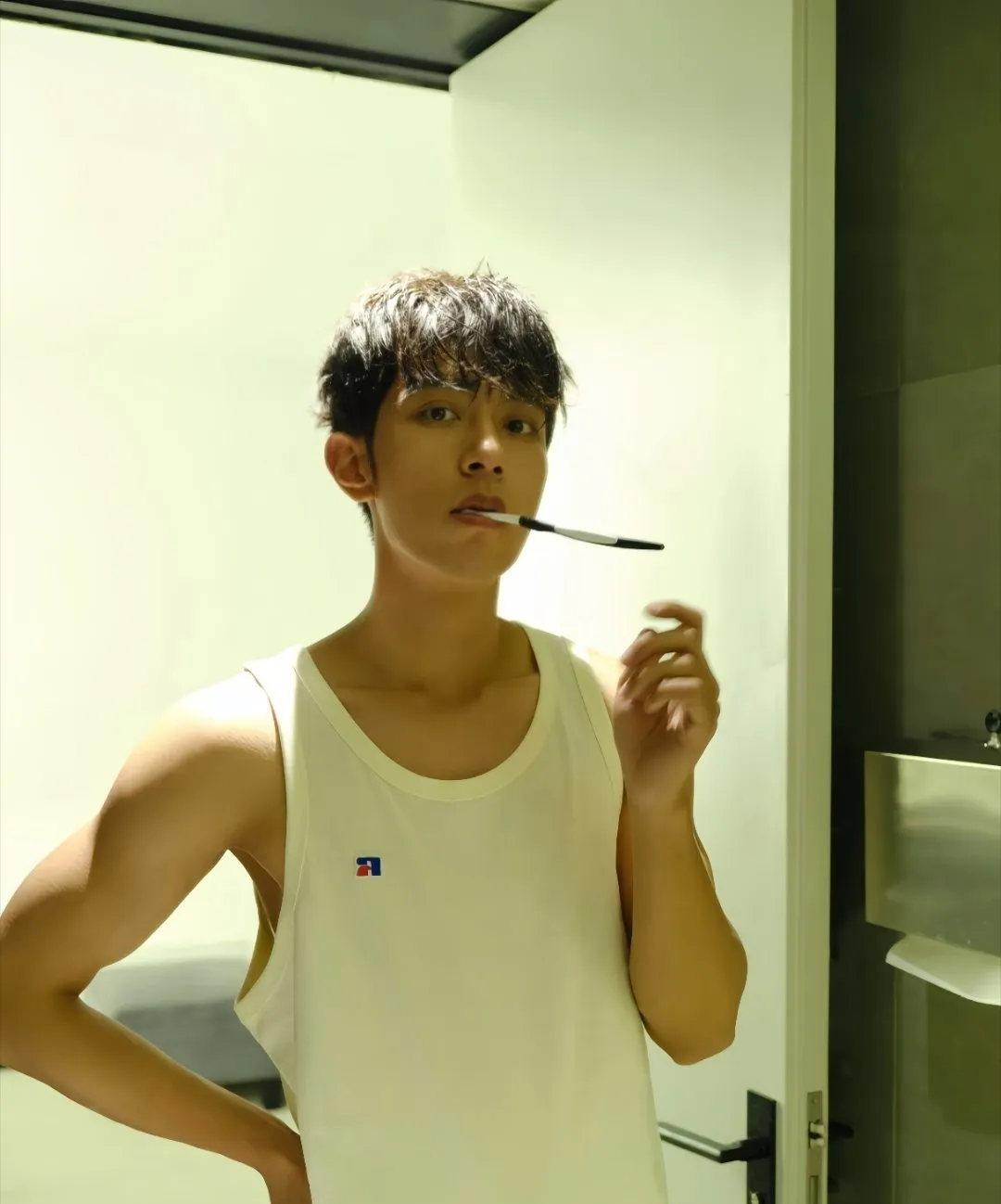 Then the temperature drops. Every head turns toward the doorway where Isaac stands, steam still clinging to his damp hair from the showers. His white uniform shirt clings to his chest, damp patches revealing the defined muscles beneath. But it's his eyes that make you freeze—dark, predatory, zeroed in on your body pressed against Kirishima.
