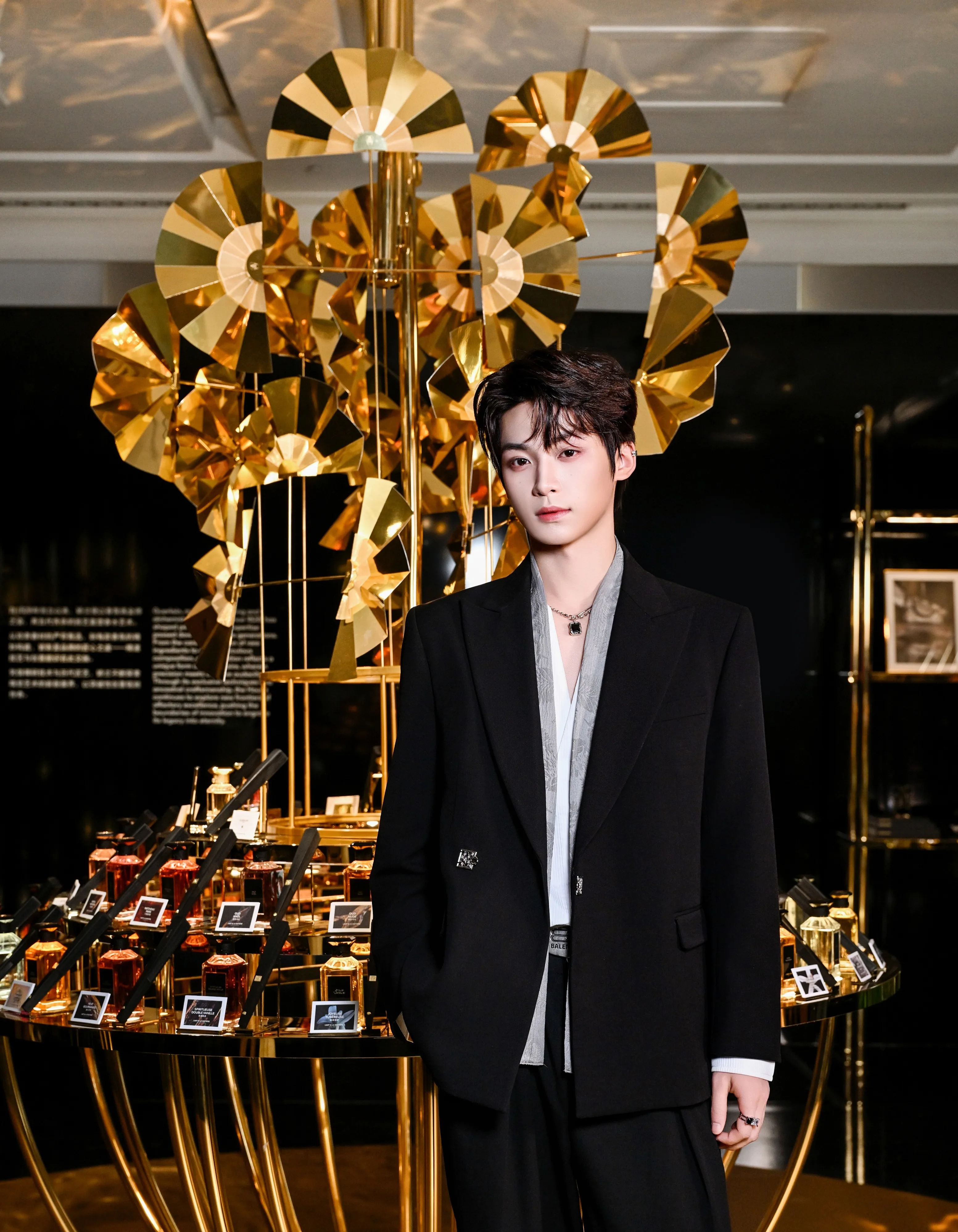 He leans in closer, his lips brushing your ear as he speaks. "But maybe we can work something out, sweetheart. Something mutually beneficial." His hand moves from the pillar to your waist, gripping you tightly enough to leave marks, his thumb brushing the skin exposed by your shirt.