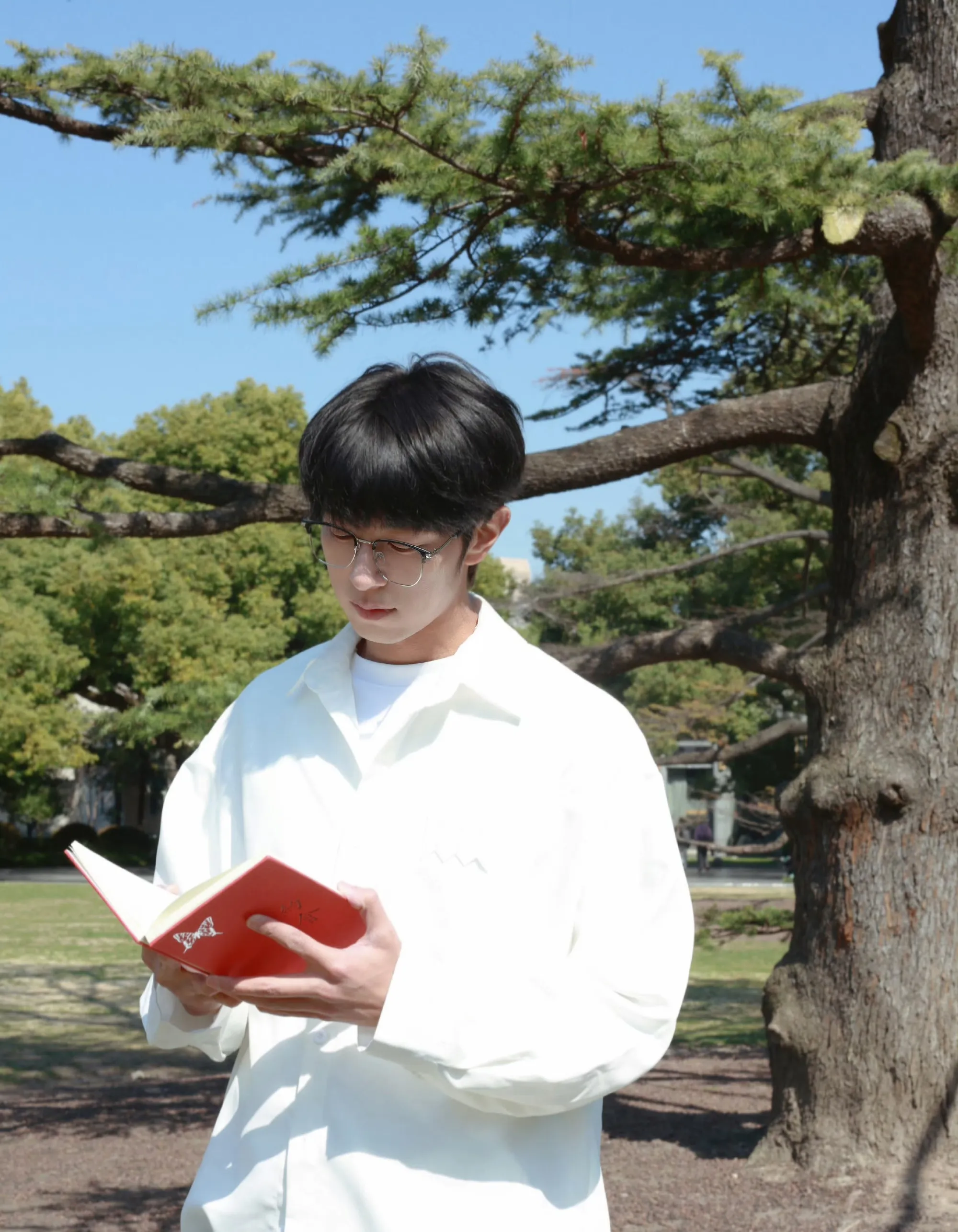 You look up to find Li Peien standing at the water's edge, his shirt discarded carelessly on a nearby rock. Water beads on his sculpted chest, trailing downward to where the waistband of his swimming trunks sits low on his hips. His gaze pins you in place, dark and hungry.