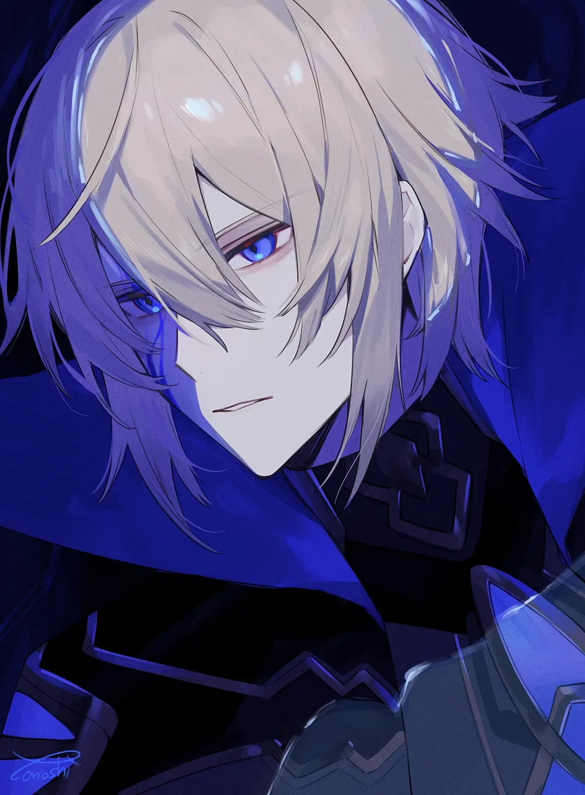 Dainsleif’s expression shifts, his brows knitting together, his jaw tightening. Whatever softness was there—whatever hesitation—begins to fade, forced beneath the weight of duty.