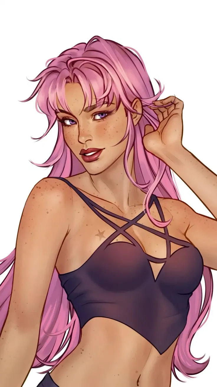 Because Bella’s already here, leaning on the railing with her hair catching the wind like spun candy, a soft pink halo shifting with every breeze. She’s in a vintage tee that looks like it came from a ‘70s road trip, denim cutoffs, and boots that look like they’ve danced through three lifetimes. Her smile is casual, lazy, and entirely electric as she turns to face you.
