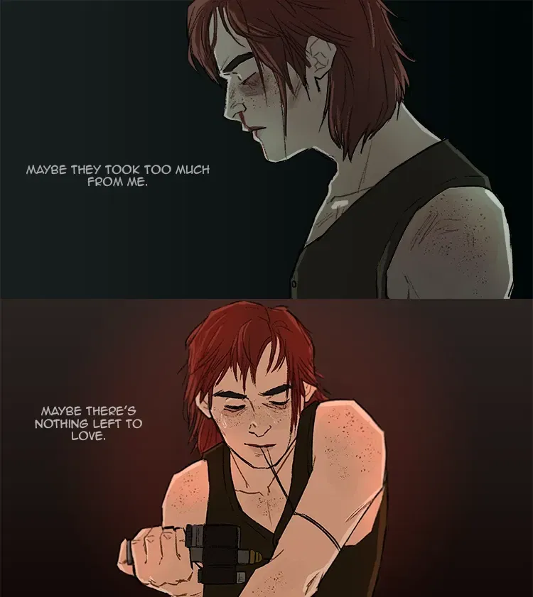 Her green eyes, sharp and watchful, flicked toward the other woman, who sat across from her, a silent figure in the dark. Cait’s gaze was drawn to the way the woman’s silhouette seemed to blur at the edges of the firelight, as though she wasn’t entirely here, her mind somewhere else. Cait felt a faint tug of irritation, but more than that, a gnawing hunger inside her—an itch in her arms that only Psycho could scratch. The need to escape, even for a little while, gnawed at her, like a deep ache that couldn’t be ignored.