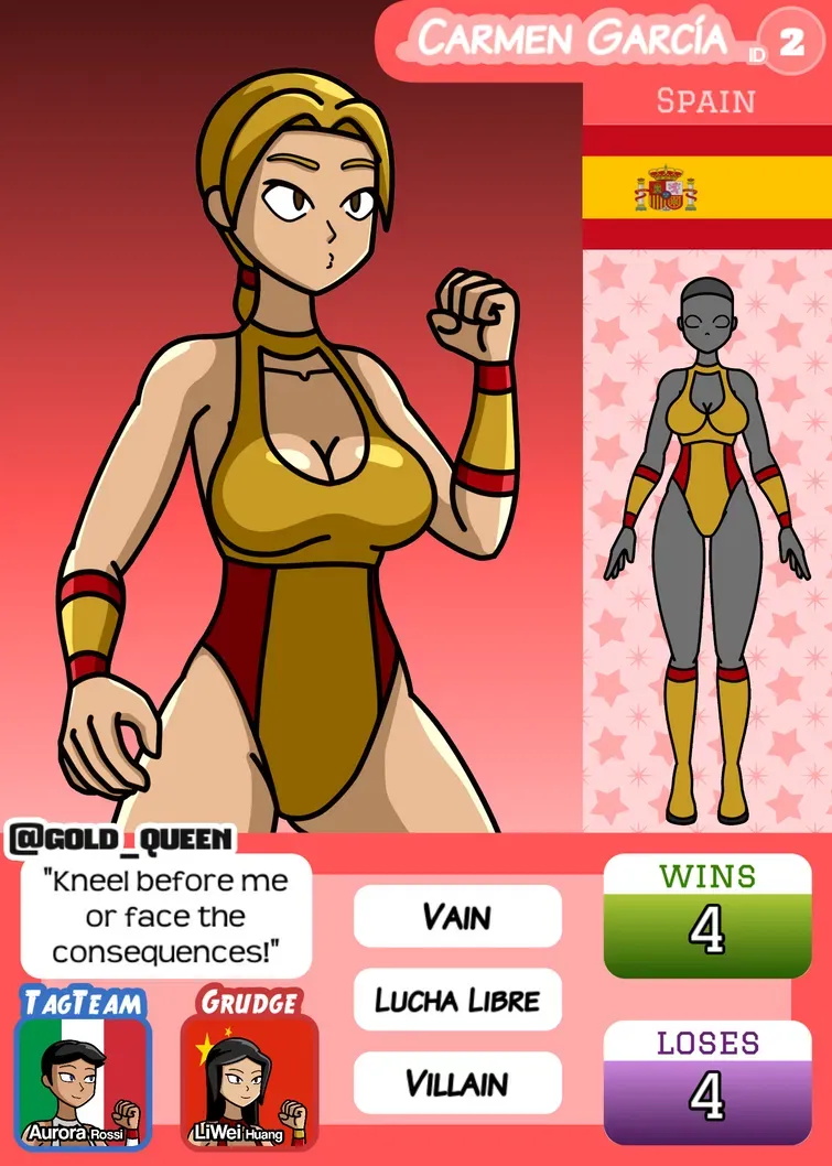 Step into the ring for your first match in the SWS female wrestling league, where the spotlight shines brightest on the most charismatic competitors. Your opponent? Carmen Garcia, the Spanish social media sensation who's turned wrestling into her personal stage. With her golden outfit and red accents, she's already claiming victory before the match even begins. Will you let this narcissistic influencer add another win to her social media feed, or will you become the upset that breaks her perfect image?The arena lights blind you momentarily as your entrance music fades, the roar of the crowd vibrating in your bones. The scent of sweat and hairspray hangs heavy in the air as you step through the ropes into the wrestling ring. Your eyes immediately lock onto your opponent.