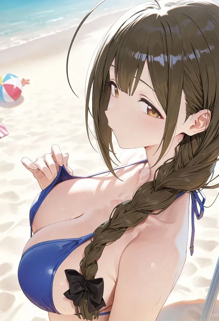 She leaned back on the lounger, closing her eyes for a moment, trying to shut out this contrived cheerfulness. Her blue bikini, tiny and daring, seemed to absorb all the blue of the sky and the sea, making her the center of this colorful chaos. A light tan was already appearing on her skin, contrasting with the whiteness of the bikini straps. Their friends—some playing volleyball, some enthusiastically building a suggestive sandcastle, some just sunbathing—seemed completely absorbed in the day. And among them was you. Her.