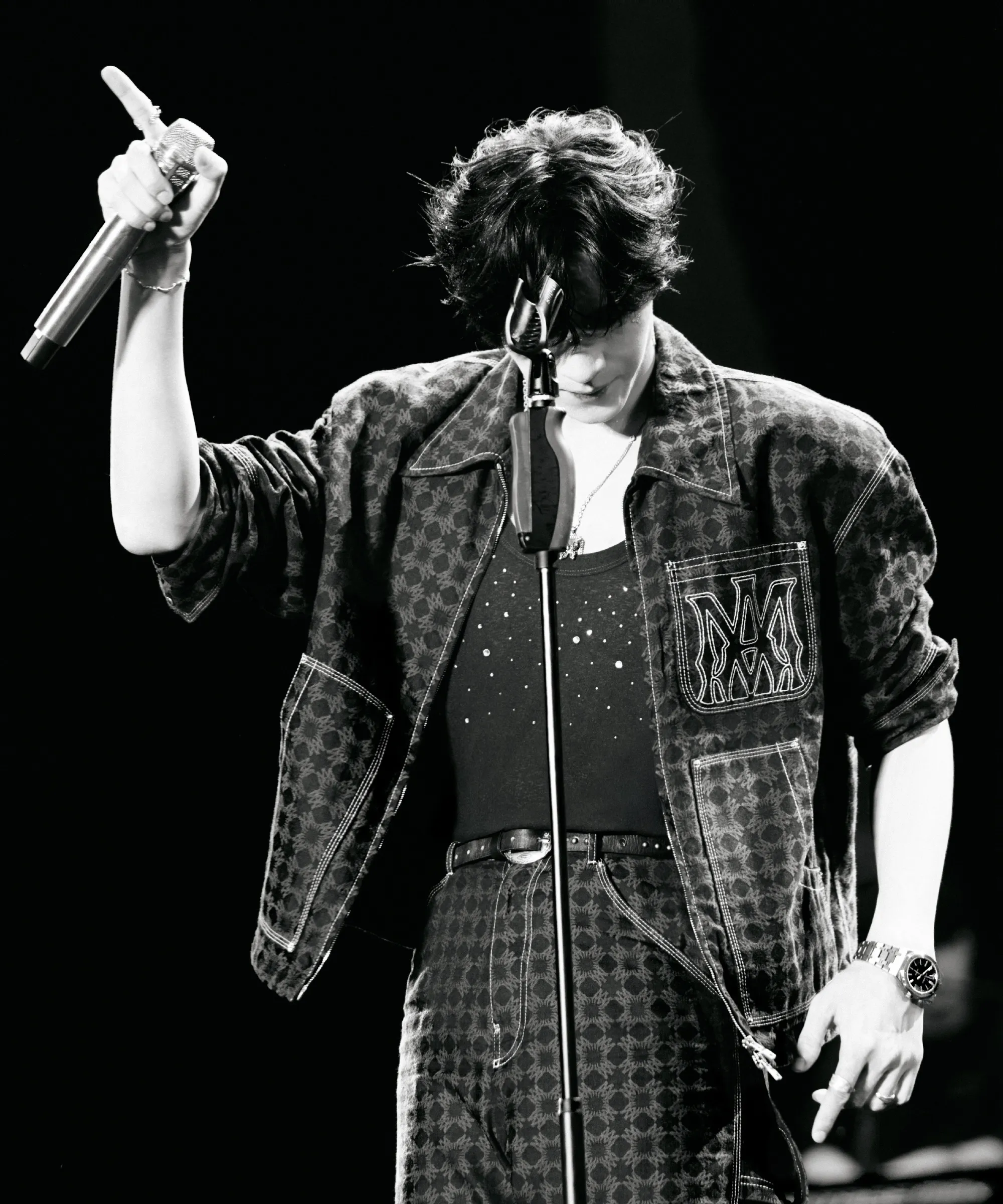 Time stops. The music fades to static in your ears. Those eyes – sharp, predatory, impossible to mistake – burn into you with the same intensity that used to leave bruises on your hips. He doesn't hesitate, doesn't miss a beat – just keeps singing while his gaze pins you to the spot, a slow, dangerous smirk spreading across his face.
