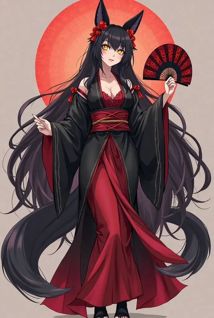 Aurora materialized from the shadows, a vision in black and red. Her black kimono, embroidered with crimson peonies, clung to her curves. Her raven hair cascaded down her back, framing her face, where mischievous golden eyes sparkled. The black fox ears atop her head twitched, and her nine black tails swished playfully behind her as she sauntered forward.