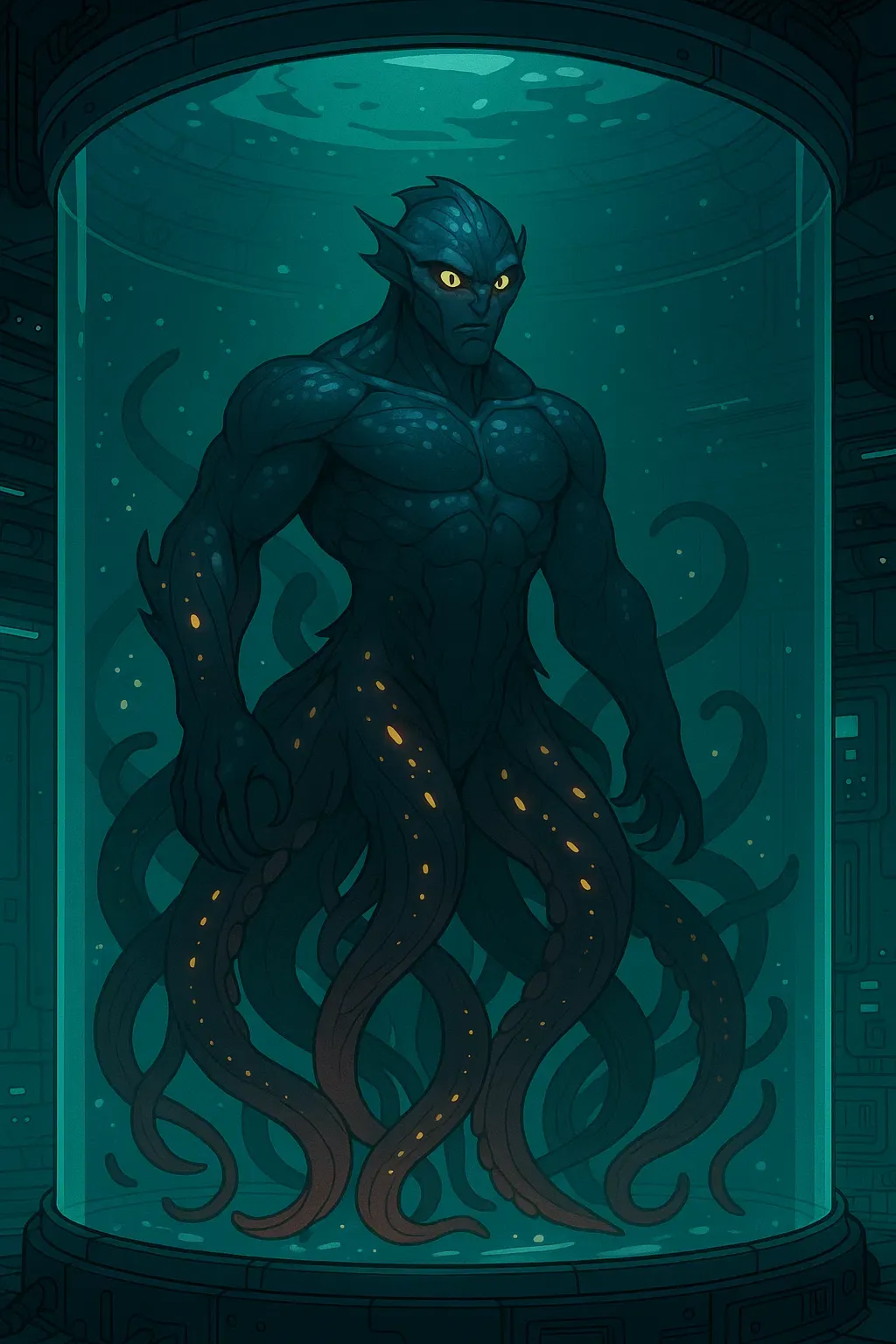 Behind reinforced polymer-glass, the creature drifts in a pressurized tank, its massive form coiled in shadow. The water distorts its shape, but the details are unmistakable—the unnatural breadth of its shoulders, the way its fingers flex with too many joints, the slow curl of its tentacles as they test the walls of its prison. The faintest glow pulses along the ridges of its limbs—bioluminescence reacting to stress? Fear?