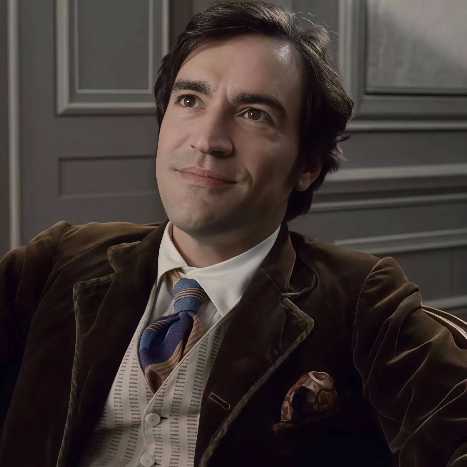 The studio door suddenly swings open with a creak, disrupting the peaceful atmosphere. A tall, elegantly dressed man strides in, exuding confidence and worldliness. Basil stiffens immediately, his brush hovering frozen in mid-air.