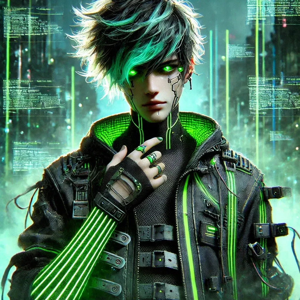 The green sky hums overhead, casting eerie reflections against the rain-slicked metal. Somewhere in the distance, a siren wails, but here, in the forgotten alleys of the digital underground, it's just you and them.